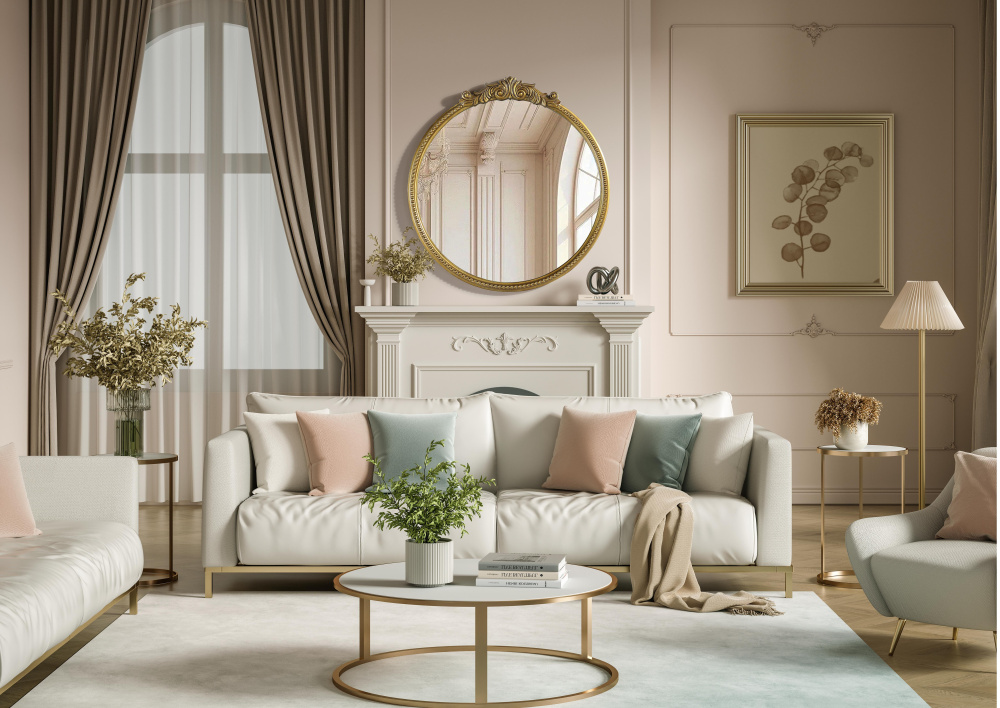 The circular frame is accented with an ornate floral and scroll crest, adding a refined, vintage-inspired touch.