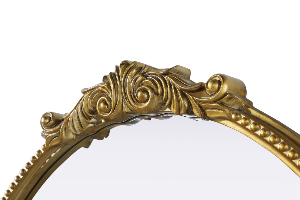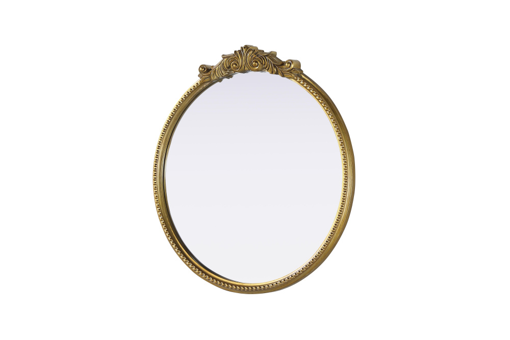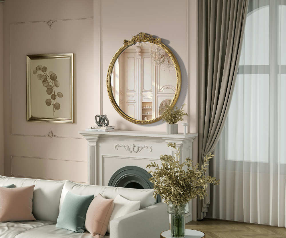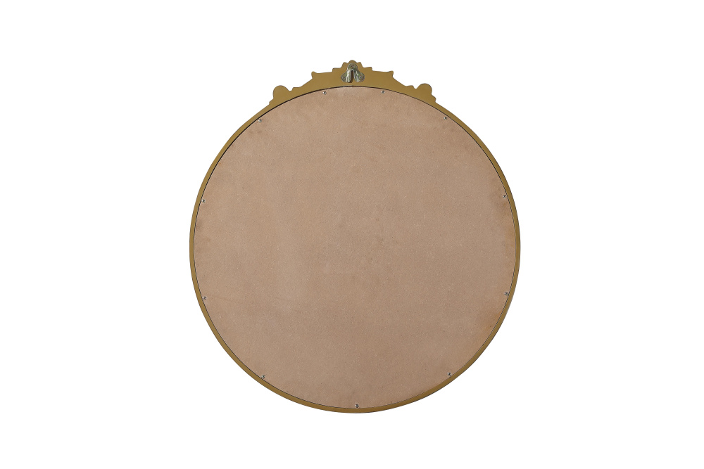 Bring vintage charm and refined craftsmanship to your space with this round wall mirror in a distressed antique brass finish. The hand-painted frame showcases ornate scroll and floral detailing, creating a timeless, old-world aesthetic. The beaded trim along the edge enhances the decorative appeal, making it an eye-catching statement piece. Crafted from resin with an MDF backing board, this mirror is lightweight yet durable. Designed for vertical hanging only, it includes a metal inset hanger for easy installation (hardware not included). Available in multiple sizes and in vintage bronze, this mirror is perfect for vanity stations, bathrooms, entryways, or living rooms, adding architectural beauty and a sophisticated touch to any space.