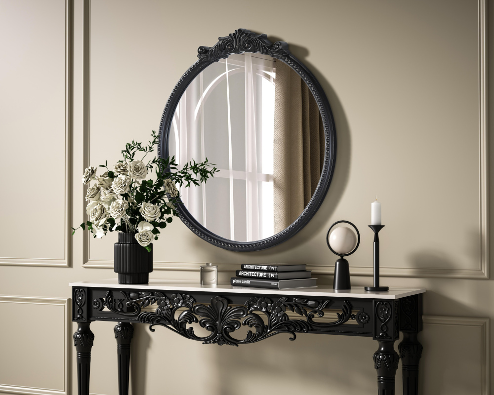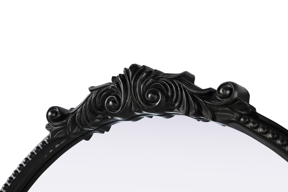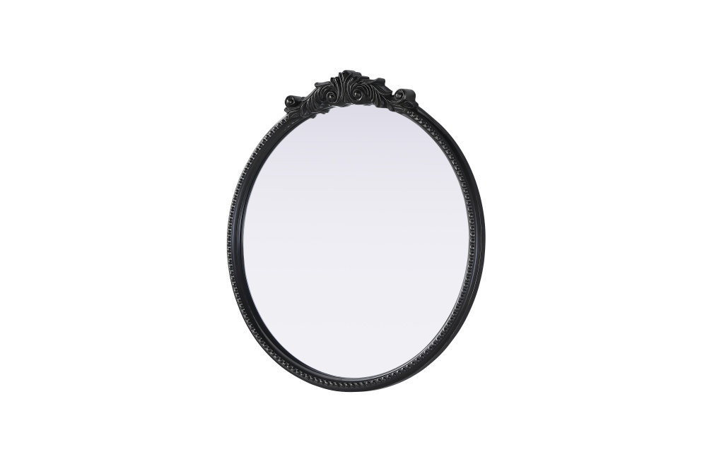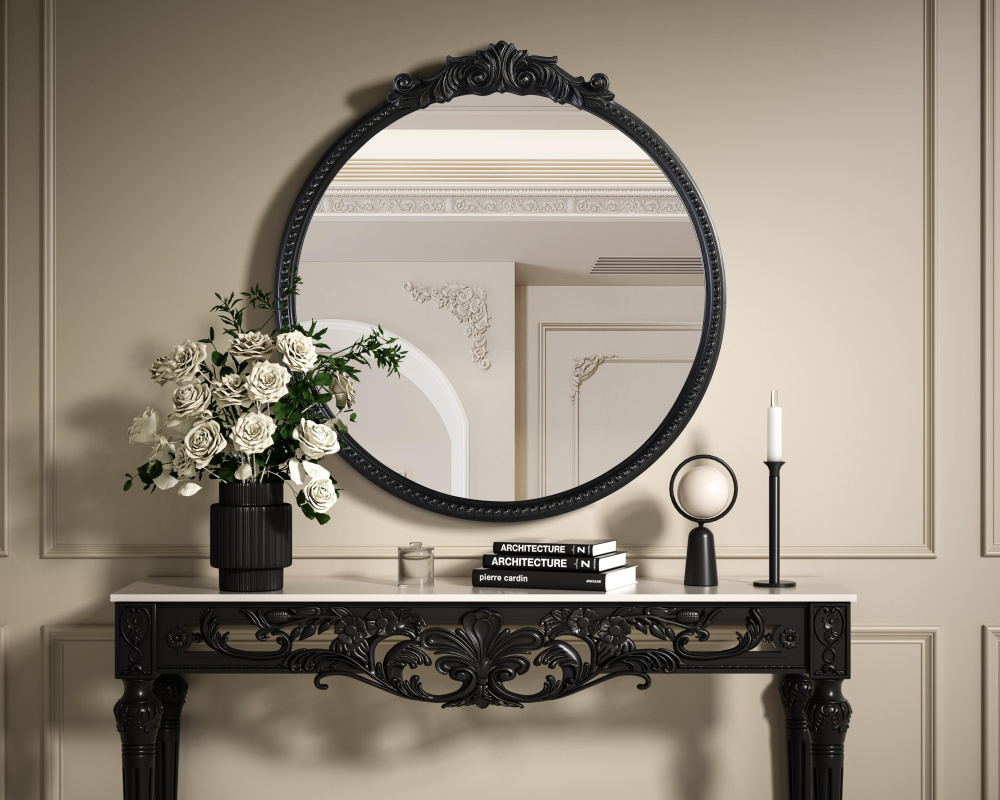 Bring vintage charm and refined craftsmanship to your space with this round wall mirror in a distressed vintage bronze finish. The hand-painted frame showcases ornate scroll and floral detailing, creating a timeless, old-world aesthetic. The beaded trim along the edge enhances the decorative appeal, making it an eye-catching statement piece. Crafted from resin with an MDF backing board, this mirror is lightweight yet durable. Designed for vertical hanging only, it includes a metal inset hanger for easy installation (hardware not included). Available in multiple sizes and an alternative antique brass finish, this mirror is perfect for vanity stations, bathrooms, entryways, or living rooms, adding architectural beauty and a sophisticated touch to any space.