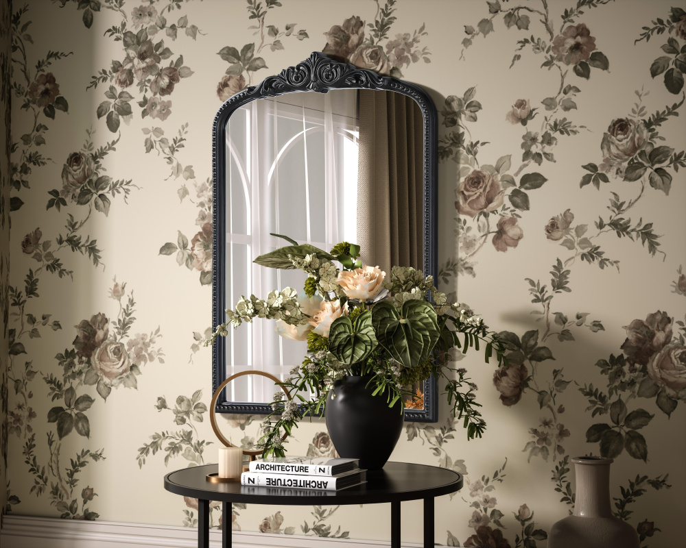 Bring classic charm and vintage character to your home with this arched wall mirror in a distressed vintage bronze finish. The hand-painted frame showcases ornate scroll and floral detailing, creating a refined, old-world aesthetic. Crafted from resin with an MDF backing board, this mirror is lightweight yet durable. Designed for vertical hanging only, it includes two metal inset hangers for easy installation (hardware not included). Whether placed above a fireplace mantel, in an entryway, or as an accent piece in a living room, this mirror enhances the space with its architectural beauty. Available in multiple sizes and an alternative antique brass finish, it is a versatile addition to classic, vintage, or French-inspired interiors.