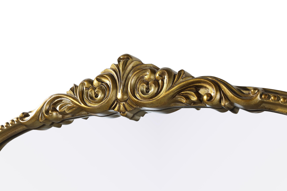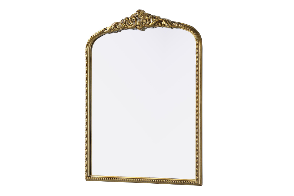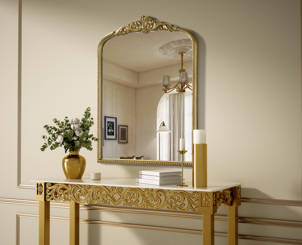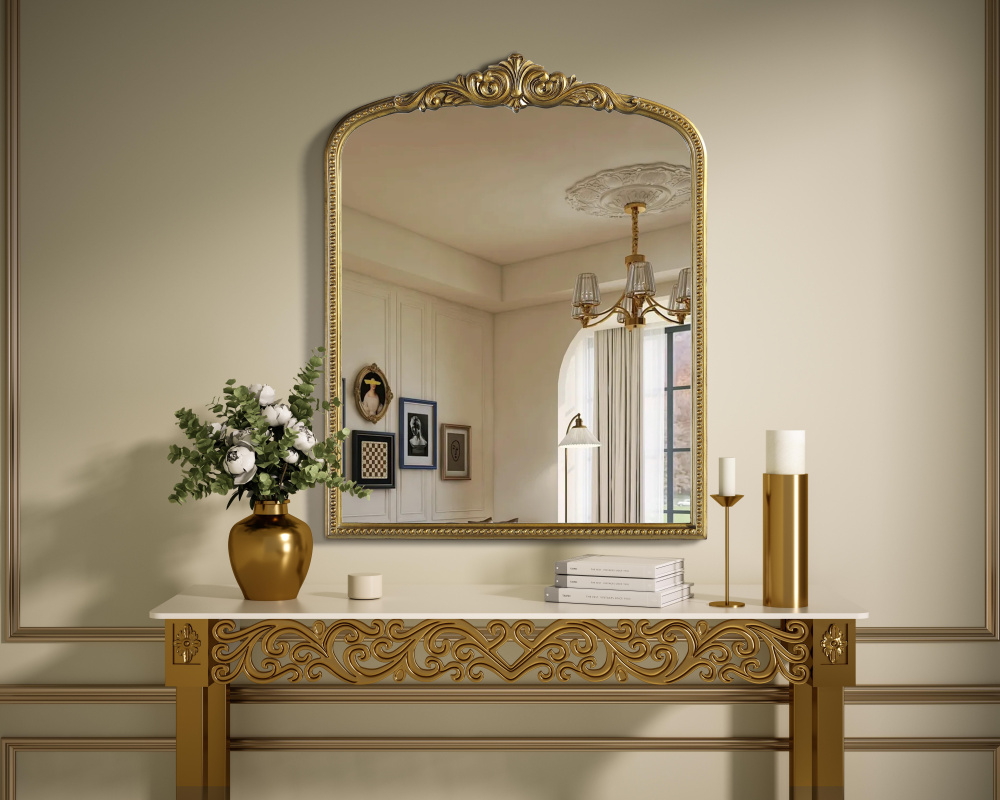 Add a touch of old-world charm to your home with this antique brass arched wall mirror, designed to bring timeless elegance and vintage character to any space. The hand-painted distressed finish gives the frame an aged, classic appeal, while the ornate crest and intricate detailing add a traditional European touch. Crafted from resin with an MDF backing board, this mirror is both lightweight and durable. Designed for vertical hanging only, it features two metal inset hangers for easy wall mounting (hardware not included). Whether placed above a fireplace mantel, in an entryway, or as an accent piece in a living room, this mirror creates a refined focal point. Available in multiple sizes and an alternative vintage bronze finish, it complements a variety of interiors, from classic and French country to vintage-inspired spaces.