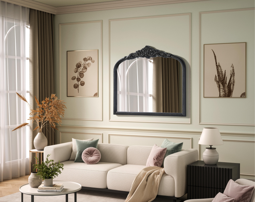 Bring classic charm and vintage character to your home with this arched wall mirror in a distressed vintage bronze finish. The hand-painted frame showcases ornate scroll and floral detailing, creating a refined, old-world aesthetic. Crafted from resin with an MDF backing board, this mirror is lightweight yet durable. Designed for vertical hanging only, it includes two metal inset hangers for easy installation (hardware not included). Whether placed above a fireplace mantel, in an entryway, or as an accent piece in a living room, this mirror enhances the space with its architectural beauty. Available in multiple sizes and an alternative antique brass finish, it is a versatile addition to classic, vintage, or French-inspired interiors.