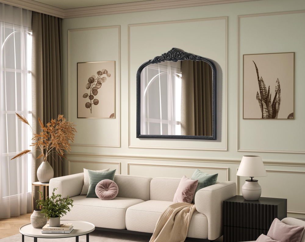 Bring classic charm and vintage character to your home with this arched wall mirror in a distressed vintage bronze finish. The hand-painted frame showcases ornate scroll and floral detailing, creating a refined, old-world aesthetic. Crafted from resin with an MDF backing board, this mirror is lightweight yet durable. Designed for vertical hanging only, it includes two metal inset hangers for easy installation (hardware not included). Whether placed above a fireplace mantel, in an entryway, or as an accent piece in a living room, this mirror enhances the space with its architectural beauty. Available in multiple sizes and an alternative antique brass finish, it is a versatile addition to classic, vintage, or French-inspired interiors.