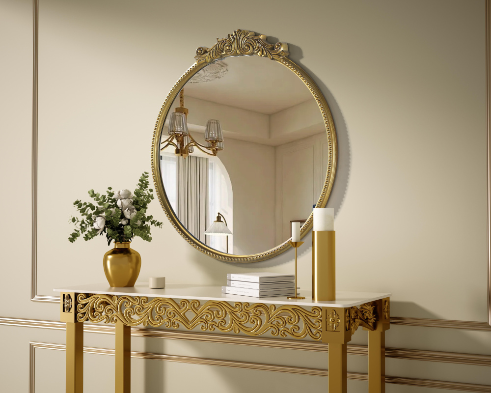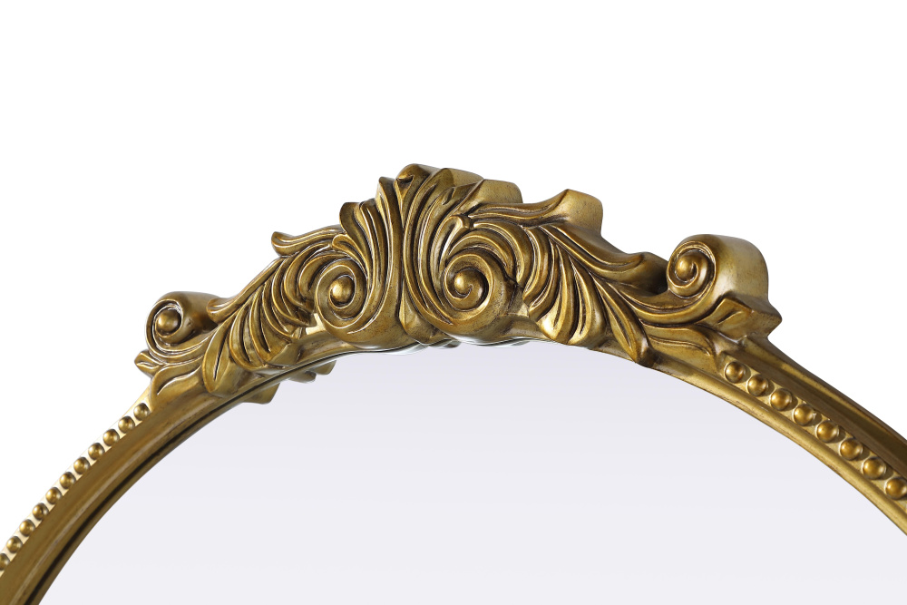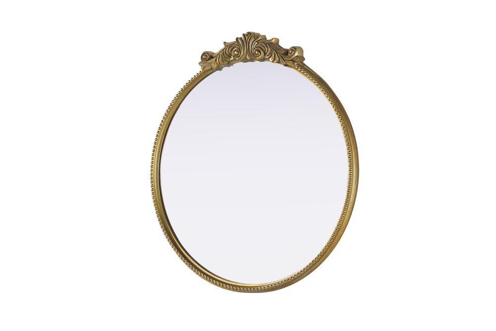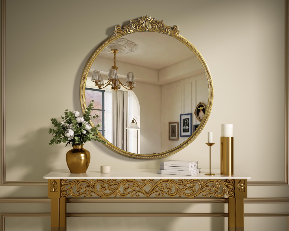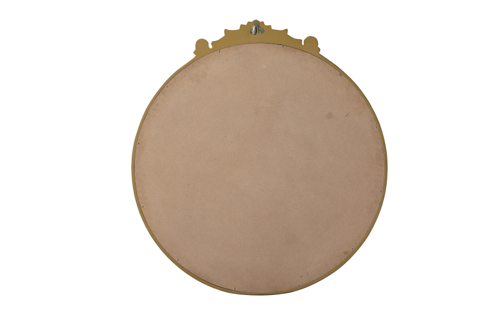 Bring vintage charm and refined craftsmanship to your space with this round wall mirror in a distressed antique brass finish. The hand-painted frame showcases ornate scroll and floral detailing, creating a timeless, old-world aesthetic. The beaded trim along the edge enhances the decorative appeal, making it an eye-catching statement piece. Crafted from resin with an MDF backing board, this mirror is lightweight yet durable. Designed for vertical hanging only, it includes a metal inset hanger for easy installation (hardware not included). Available in multiple sizes and in vintage bronze, this mirror is perfect for vanity stations, bathrooms, entryways, or living rooms, adding architectural beauty and a sophisticated touch to any space.