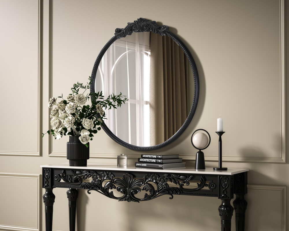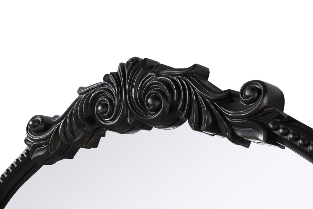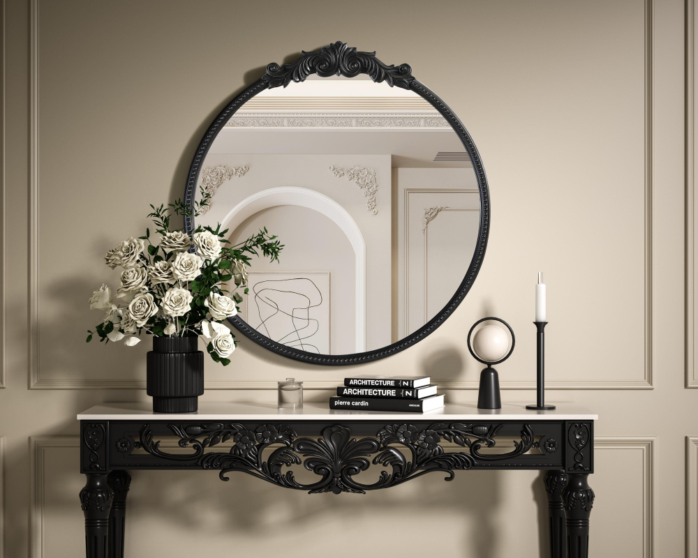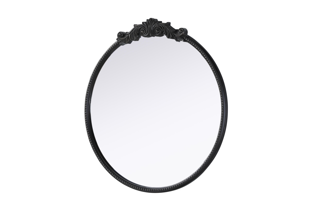 Bring vintage charm and refined craftsmanship to your space with this round wall mirror in a distressed vintage bronze finish. The hand-painted frame showcases ornate scroll and floral detailing, creating a timeless, old-world aesthetic. The beaded trim along the edge enhances the decorative appeal, making it an eye-catching statement piece. Crafted from resin with an MDF backing board, this mirror is lightweight yet durable. Designed for vertical hanging only, it includes a metal inset hanger for easy installation (hardware not included). Available in multiple sizes and an alternative antique brass finish, this mirror is perfect for vanity stations, bathrooms, entryways, or living rooms, adding architectural beauty and a sophisticated touch to any space.