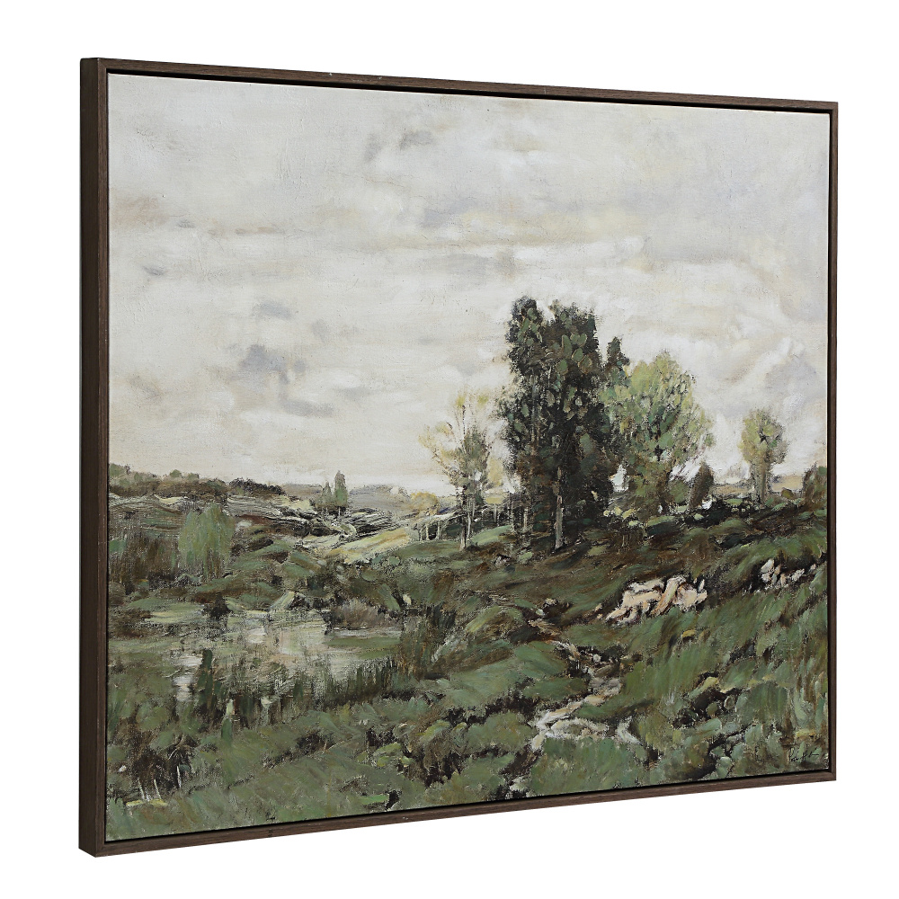There’s nothing like beautiful landscape art to elevate a space with timeless charm. This oversized canvas features artfully applied hand-painted embellishments to deliver a one-of-a-kind look to any room. Bordered with a dark brown wood veneer frame, this painting is a great match for transitional interiors.