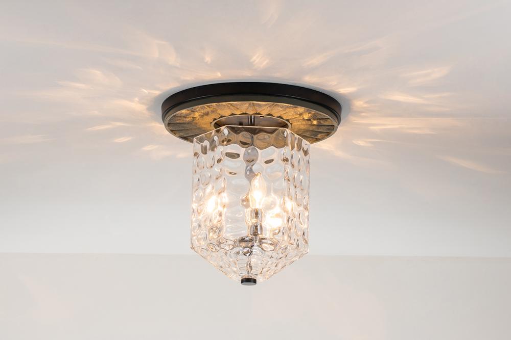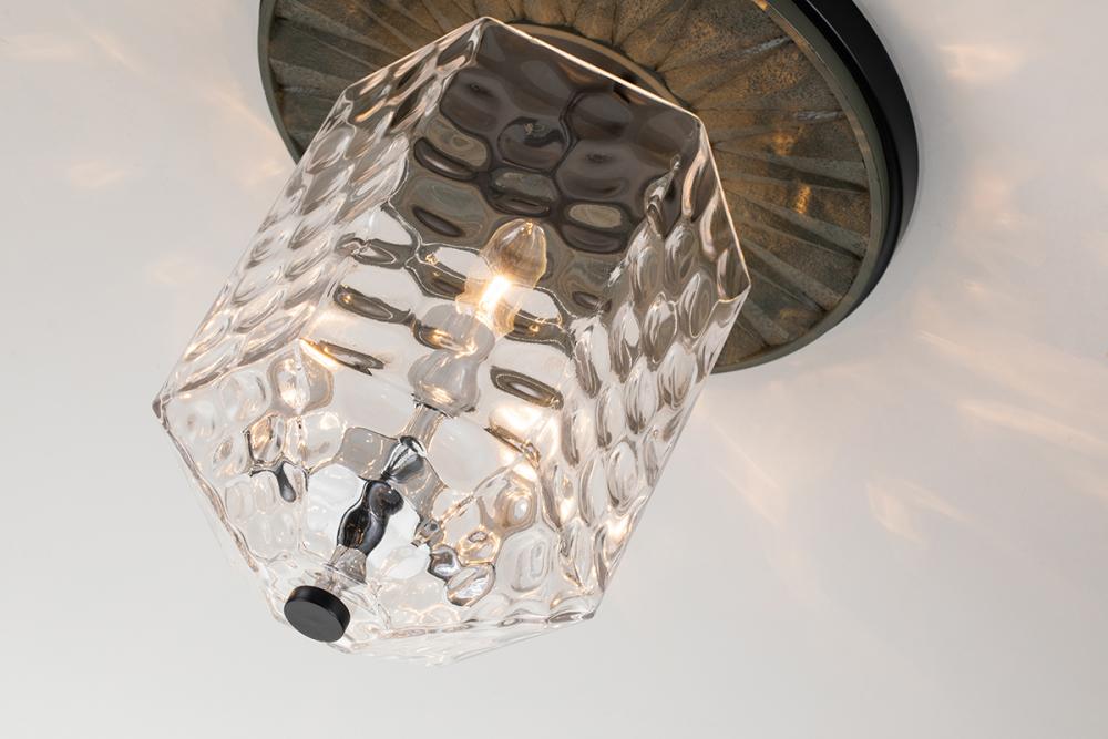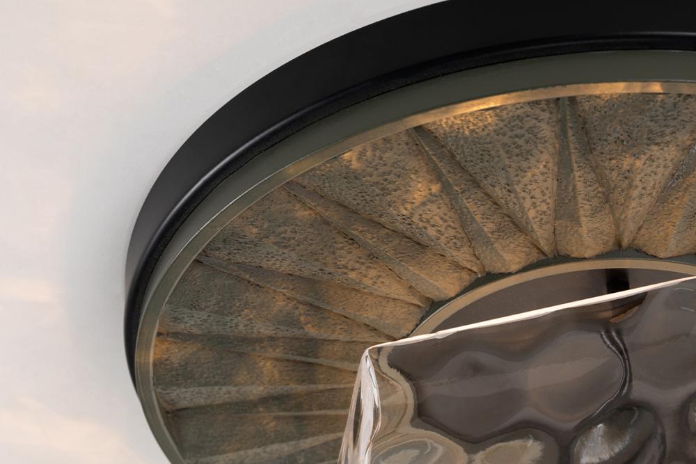 A warm, modern 14" dia., 14" high flush mount in grey and black. With a textured canopy, water glass shade, and forged metal finish, it’s perfect for damp entryways, halls, or bathrooms, delivering contemporary charm and light.