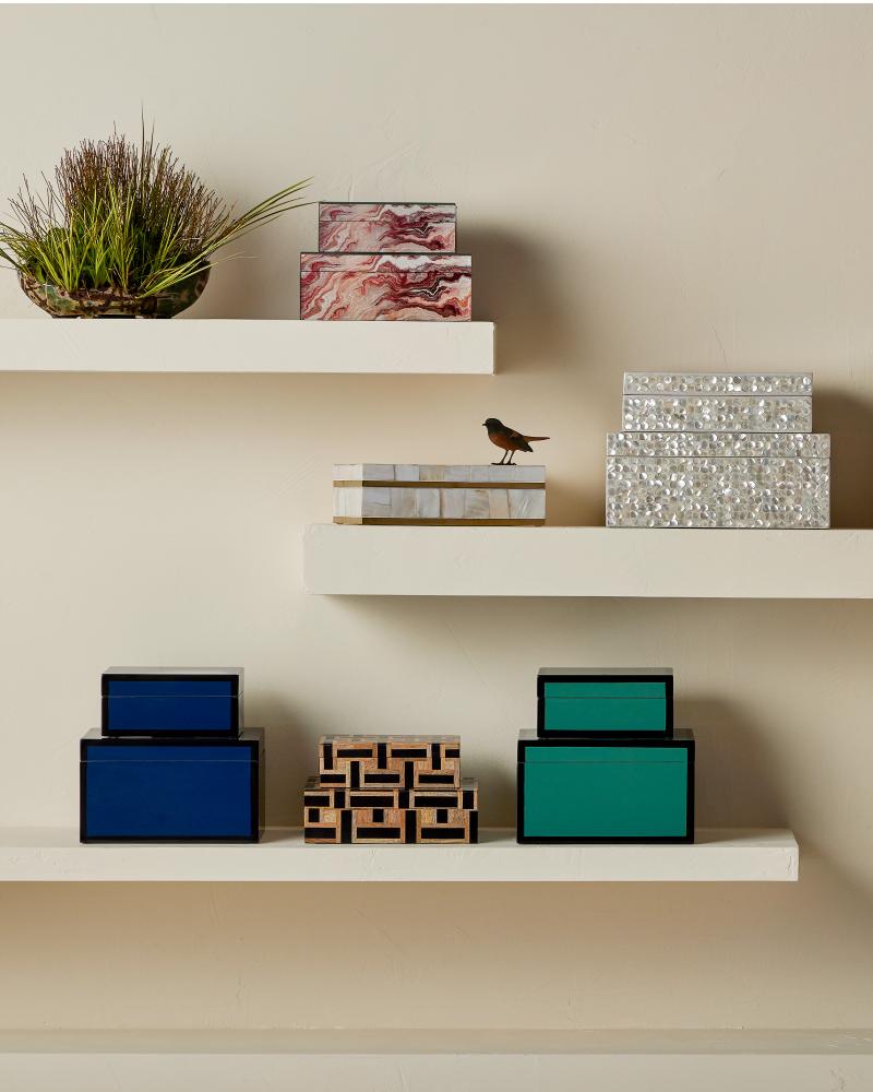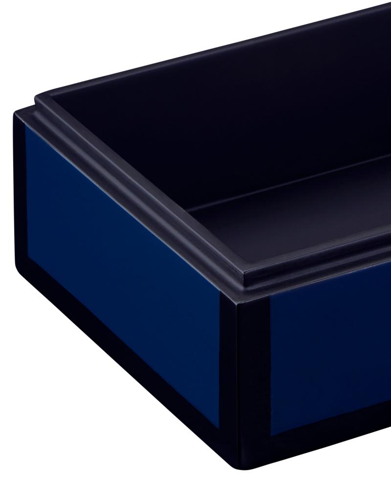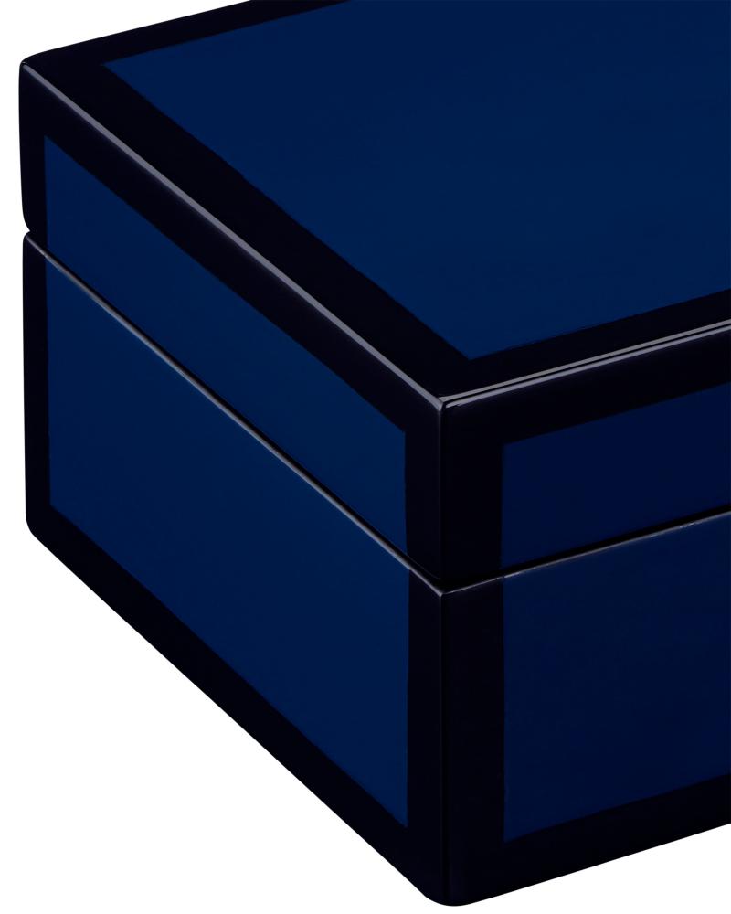 Nothing beats the sheen of lacquer where decorative boxes are concerned, as is evident in the sleek surfaces of the Navy Lacquer Box Set. Made of wood, the pair of boxes have been covered in the time-honored process that has been valued in interior design for so long. The glossy navy surfaces are rimmed in rich black, and the interiors are in a matte black finish. The pair of blue boxes are made to nest.
