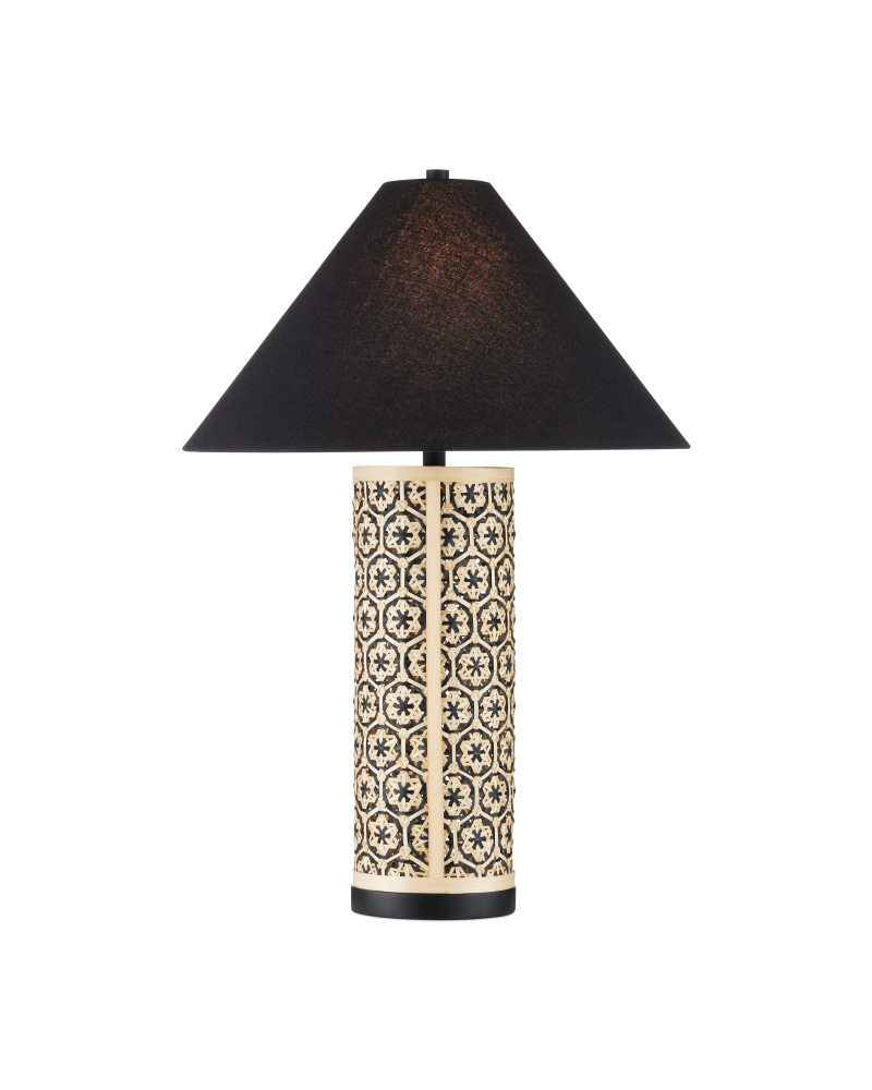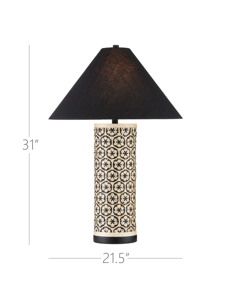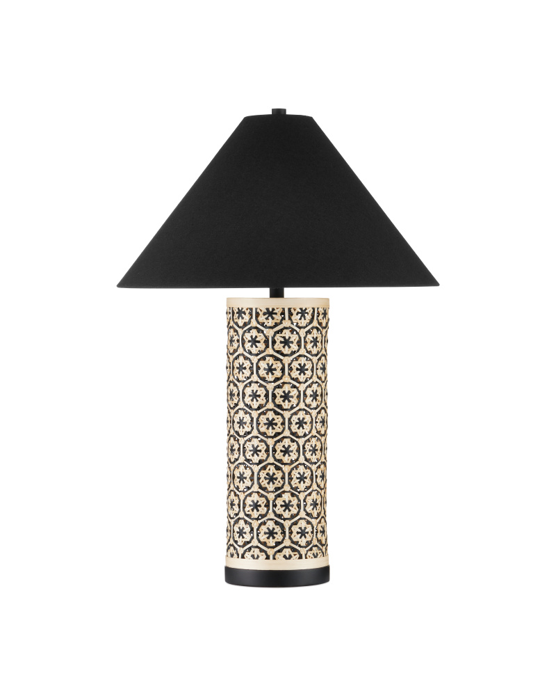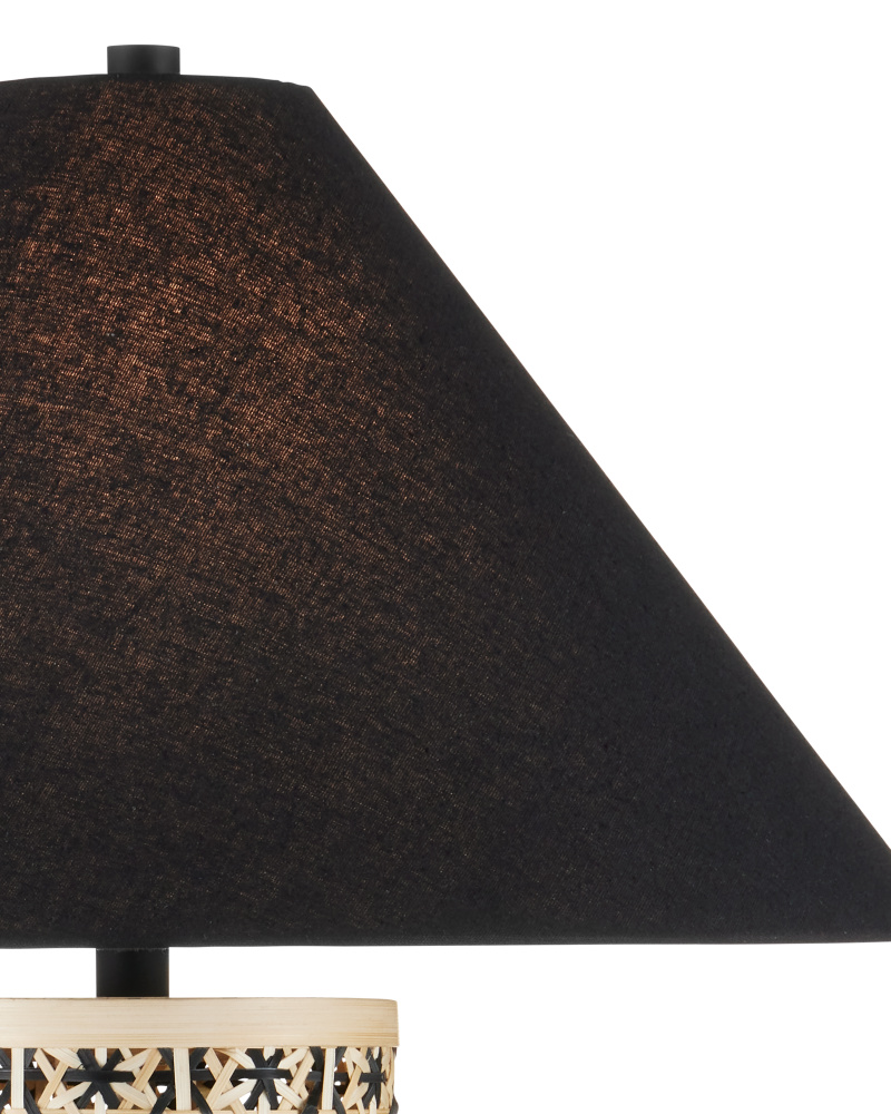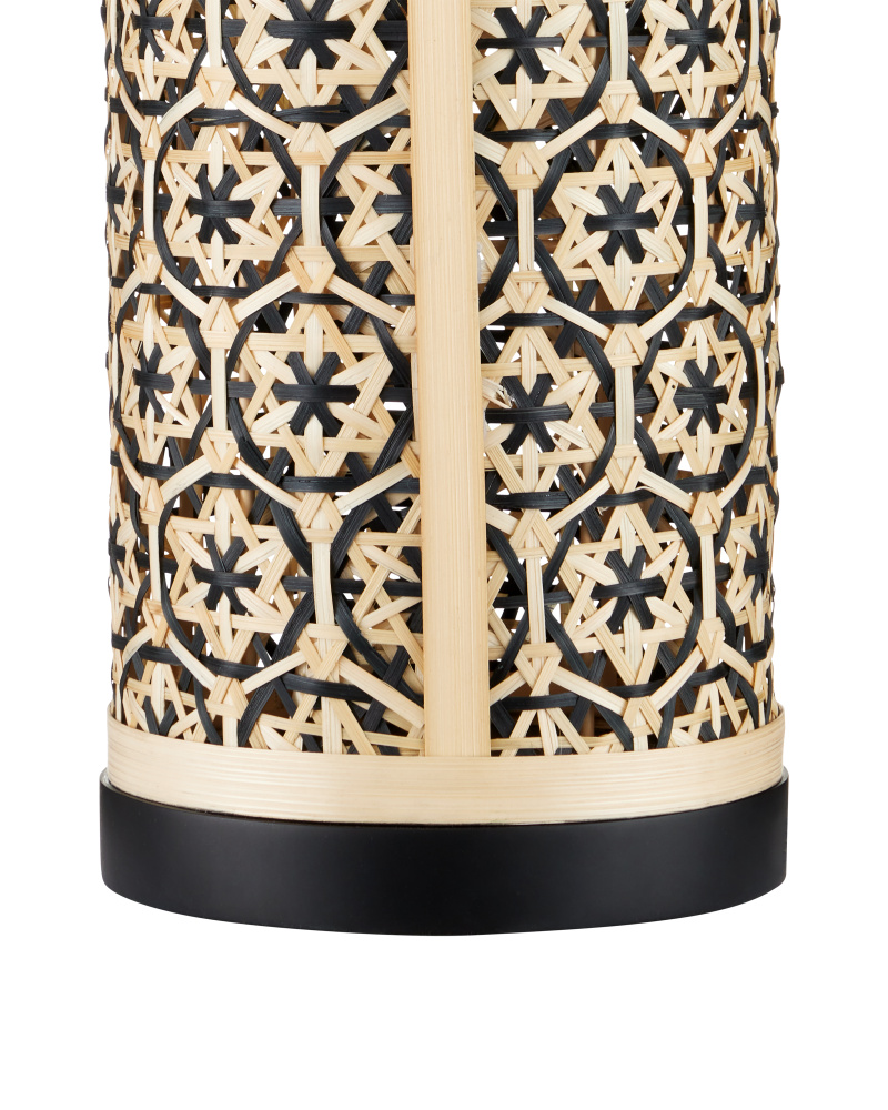 The motifs on the columnar body of the Nebulon Table Lamp are hand woven in a traditional Vietnamese pattern called star-weaving. The artform, which is generations old, involves intermingling black-dyed and natural bamboo into the pattern. The metal base and hardware complement the black empire shade, which amplifies the dark tones in the lamp’s body. Each lamp will vary slightly due to the hand-made uniqueness of each weave.