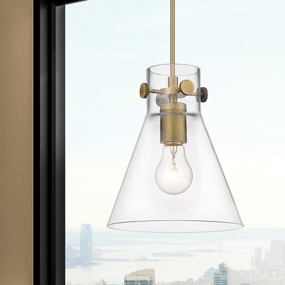 Newton Cone - 1 Light - 8 inch - Brushed Brass - Clear Shade - Cord hung - Pendant