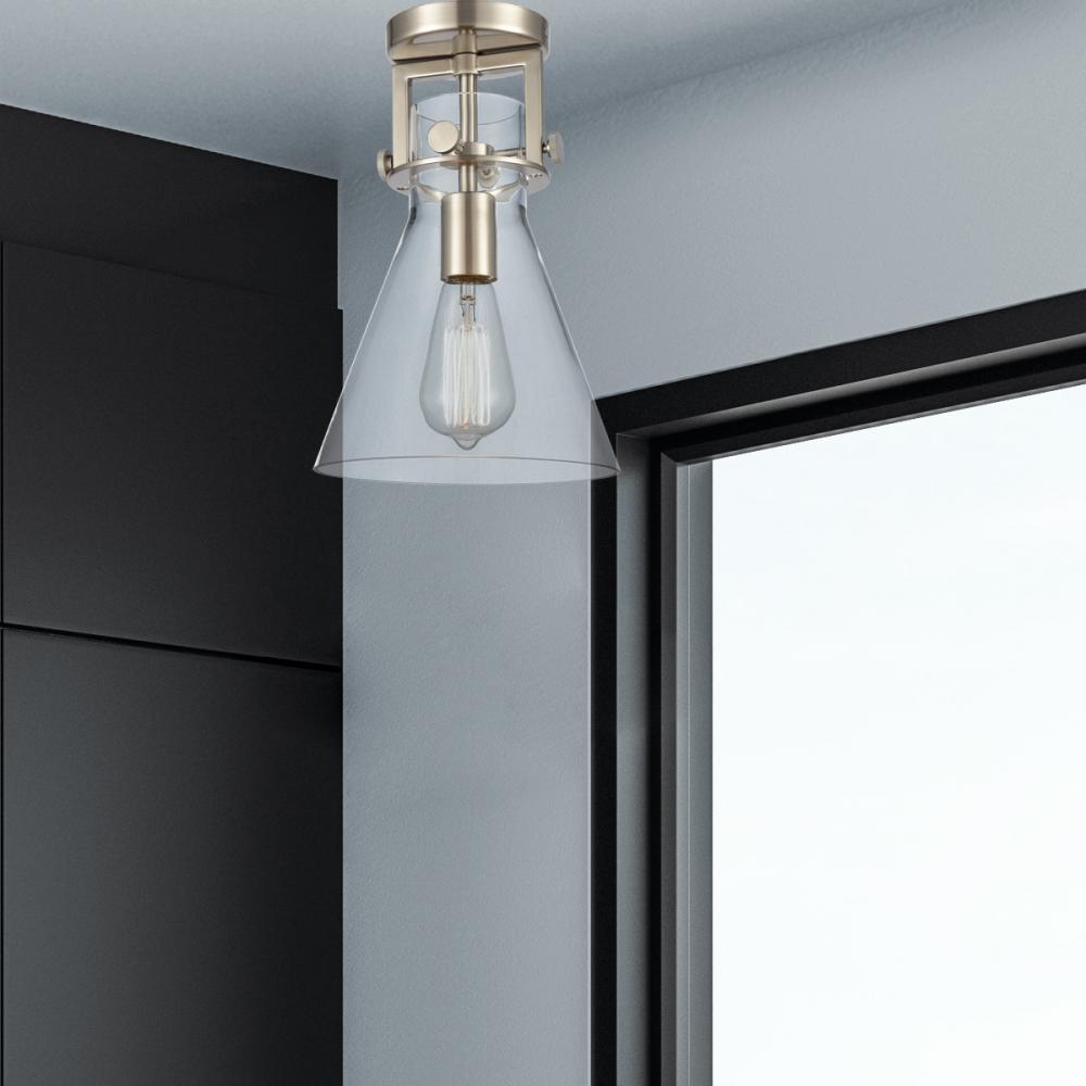 Newton Cone - 1 Light - 8 inch - Brushed Satin Nickel - Clear Shade - Semi-Flush Mount
