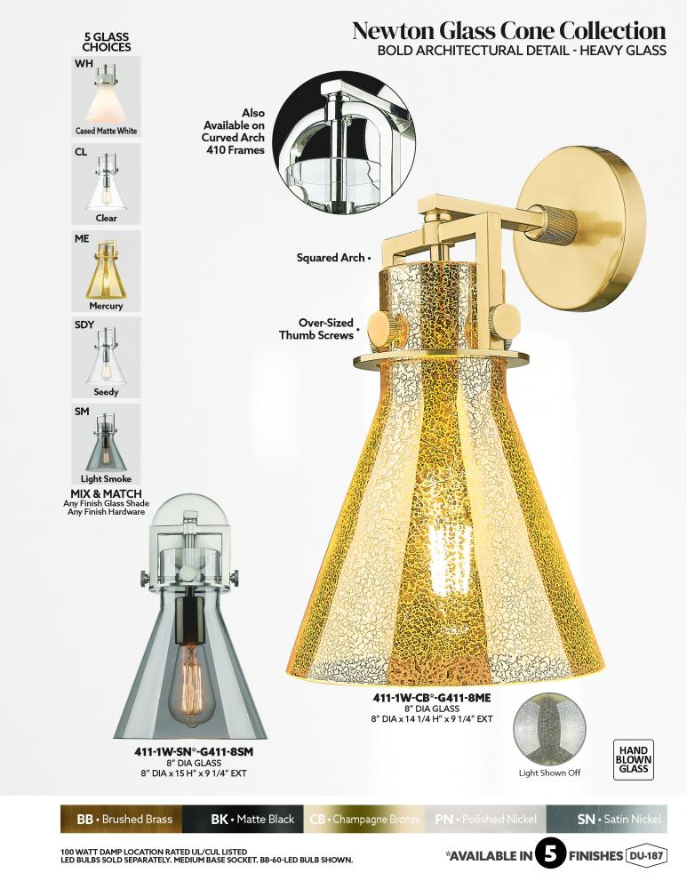 The Newton is a modern industrial collection that incorporates Exceptional architectural details and heavy metal design. These fixtures come together with a cone, bell, or sphere shaped shade, in metal or glass. Making this collection perfect for creating