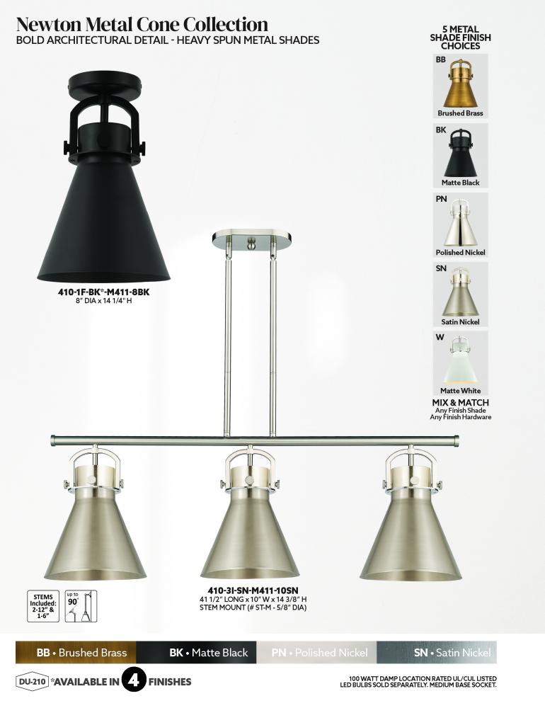 The Newton Cone is a modern industrial collection that incorporates exceptional architectural details and an equally striking cone shaped shade. The geometric shape of the glass or metal shade give this collection a charming and timeless presence.
