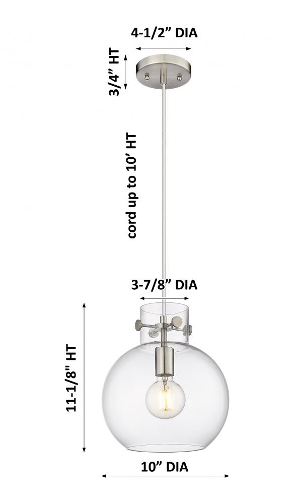 Newton Sphere - 1 Light - 10 inch - Satin Nickel - Clear Shade - Cord hung - Pendant