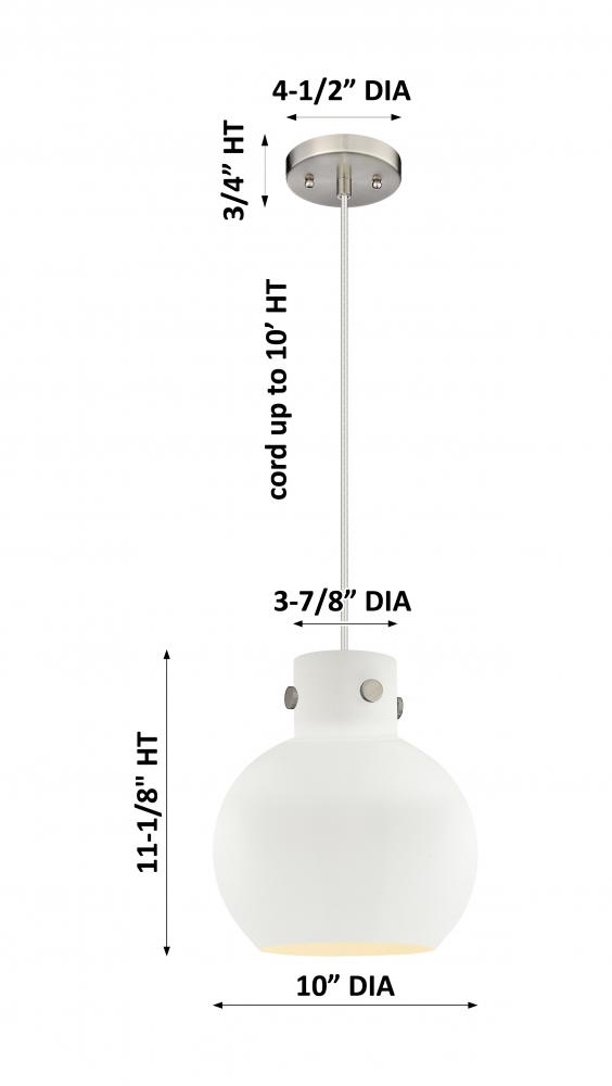 Newton Sphere - 1 Light - 10 inch - Satin Nickel - Matte White Shade - Cord hung - Pendant
