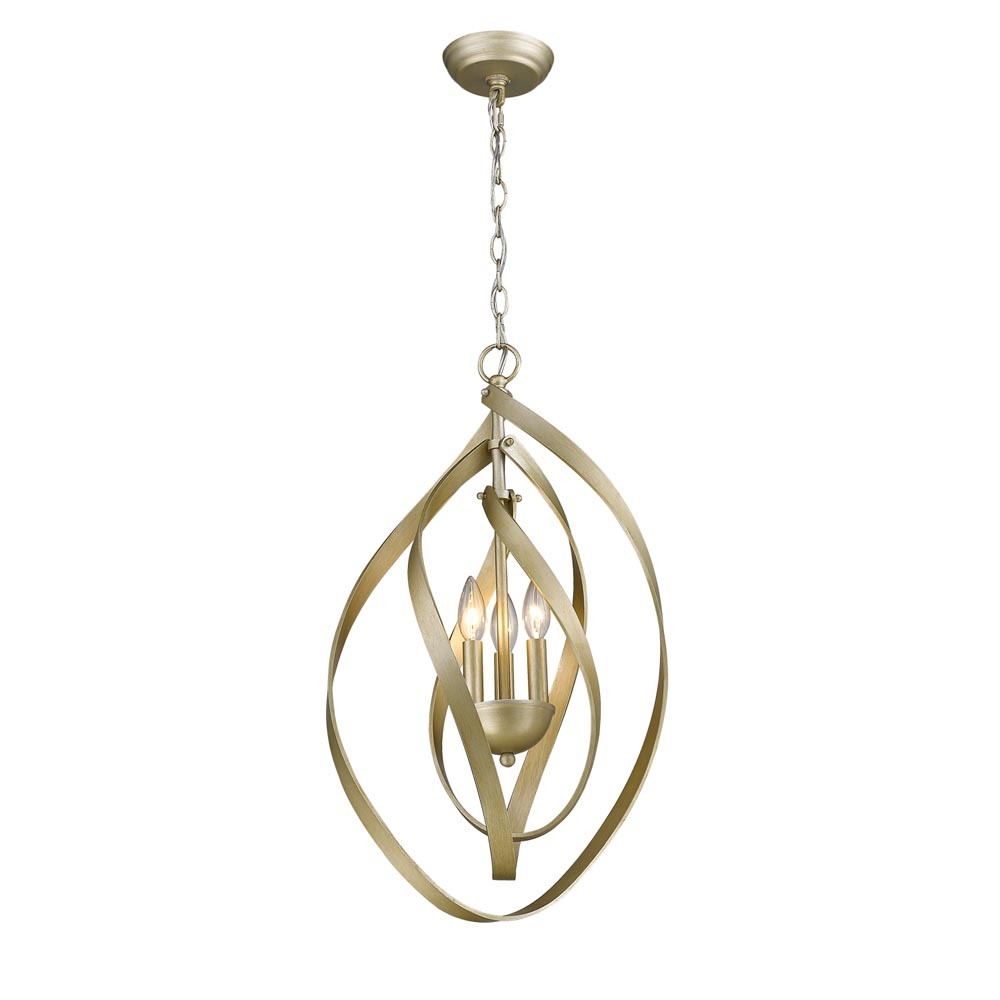 Make a statement with this fashionable jewelry-inspired design. Golden Lighting?s Nicolette marries beauty with functionality. This unique collection features simple lamps caged by asymmetrical rings in graduated sizes. The lines of the twisted, teardrop cages are hand-bent and have beautiful, rhythmic flow. A brushed White Gold finish creates a delicate appearance, but these fixtures are composed of durable steel and are made to last. Confidently adorn your home with these stunning fixtures. They are true showstoppers! This 3-light pendant is comfortably sized for a small nook, dining, or an entry.
