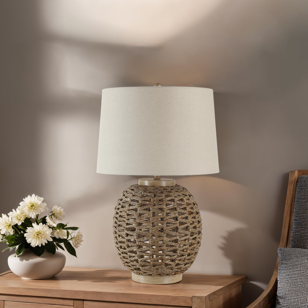 Create a relaxed setting in any space with the Noa table lamp. Crafted with a woven rope and wood-look body, brass-plated accents and an oatmeal linen shade, the resulting look is easy-breezy and cozy. Plus, 3-way lighting delivers adjustable ambiance to help set the perfect mood in any room.