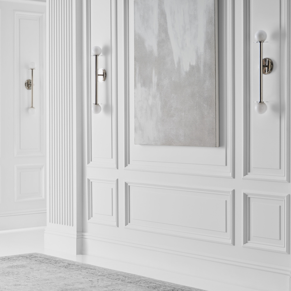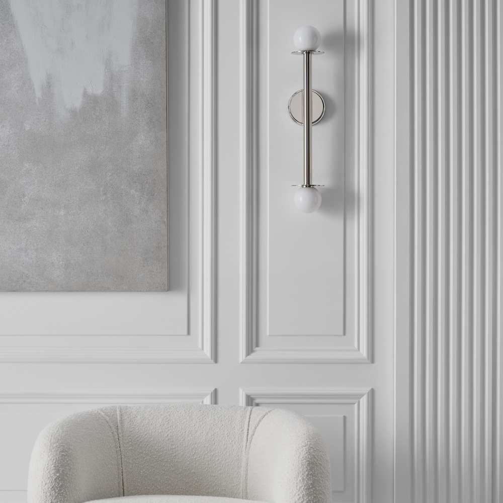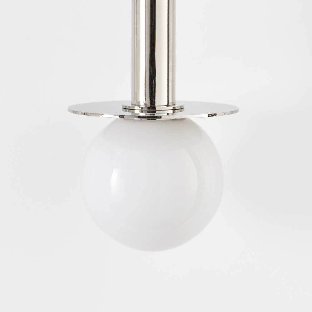 Nodes task, ceiling and wall lighting are minimal yet bold, highlighting Kelly's distinctive juxtaposition of mixed-materiality and curvilinear form. Light radiates from milk glass globes. Hanging fixtures within this family feature black fabric cords, while pivot sconces can be a cord, plug, or hard wire.