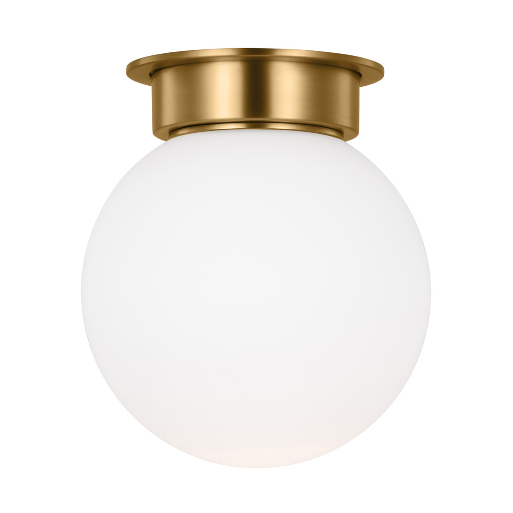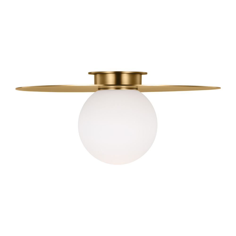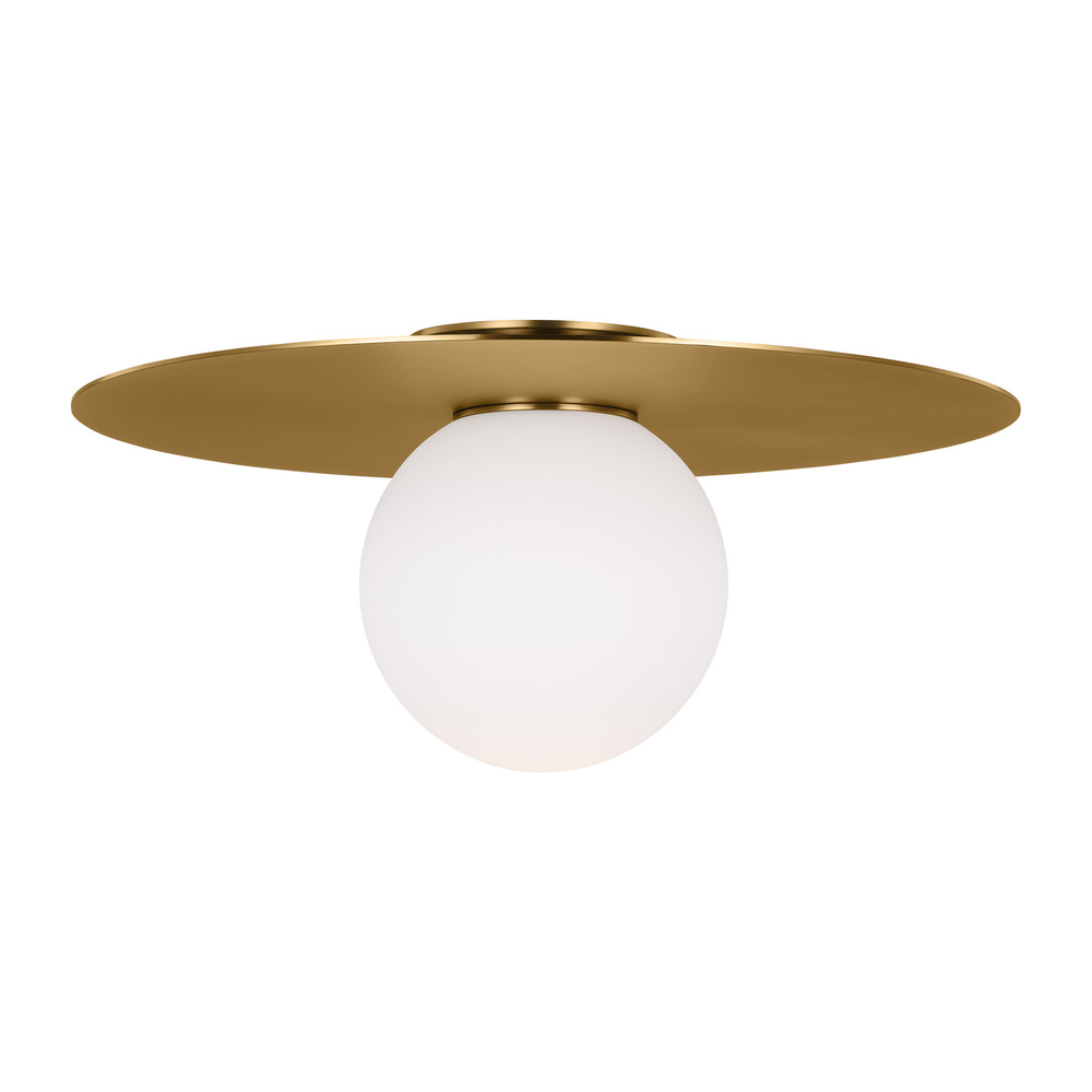 The Nodes one light flush mount fixture in burnished brass is the perfect way to achieve your desired fashion or functional needs in your home. Nodes task, ceiling and wall lighting is minimal yet bold, highlighting Kelly's distinctive juxtaposition of mixed-materiality and curvilinear form. Light radiates from milk glass globes set against metal discs. All fixtures can be used or without the discs. The cast canopy is available in Burnished Brass or Midnight Black. Hanging fixtures within this family feature black fabric cords, while pivot sconces can be cord and plug or hard wire.
