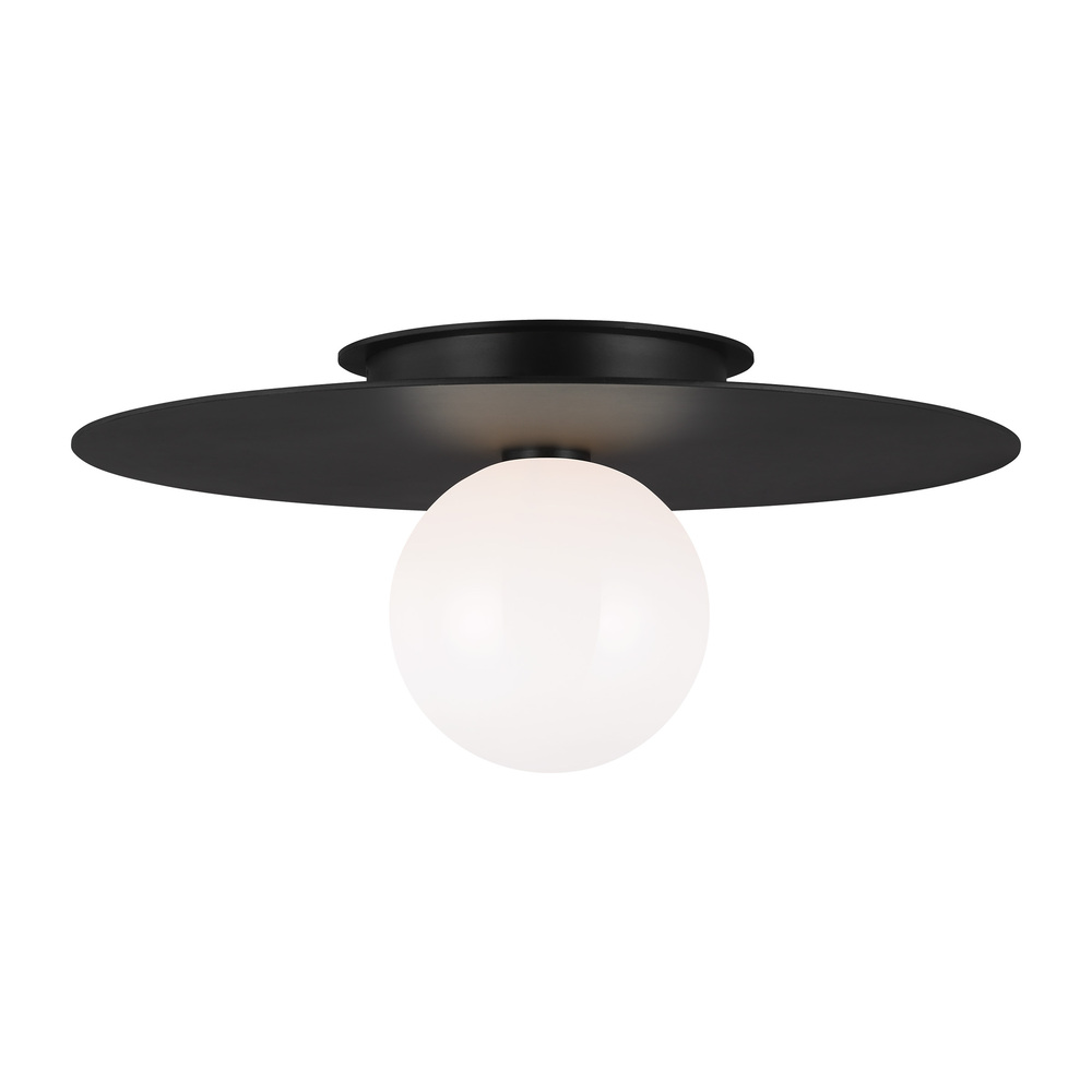 Nodes task, ceiling and wall lighting is minimal yet bold, highlighting Kelly's distinctive juxtaposition of mixed-materiality and curvilinear form. Light radiates from milk glass globes set against metal discs. All fixtures can be used or without the discs. The cast canopy is available in Burnished Brass or Midnight Black. Hanging fixtures within this family feature black fabric cords, while pivot sconces can be cord and plug or hard wire.