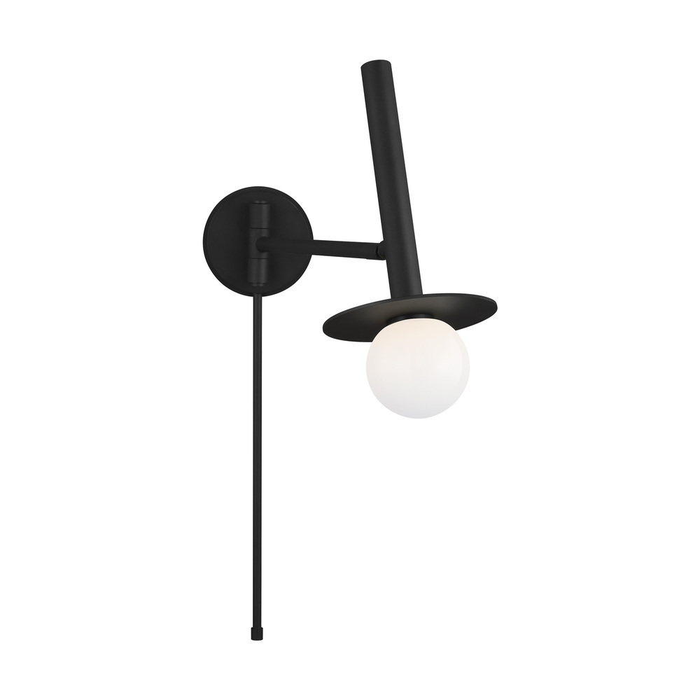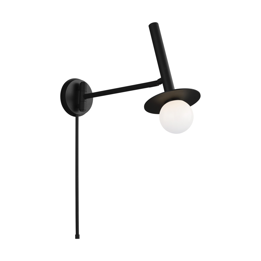 Nodes task, ceiling and wall lighting is minimal yet bold, highlighting Kelly's distinctive juxtaposition of mixed-materiality and curvilinear form. Light radiates from milk glass globes set against metal discs. All fixtures can be used or without the discs. The cast canopy is available in Burnished Brass or Midnight Black. Hanging fixtures within this family feature black fabric cords, while pivot sconces can be cord and plug or hard wire.