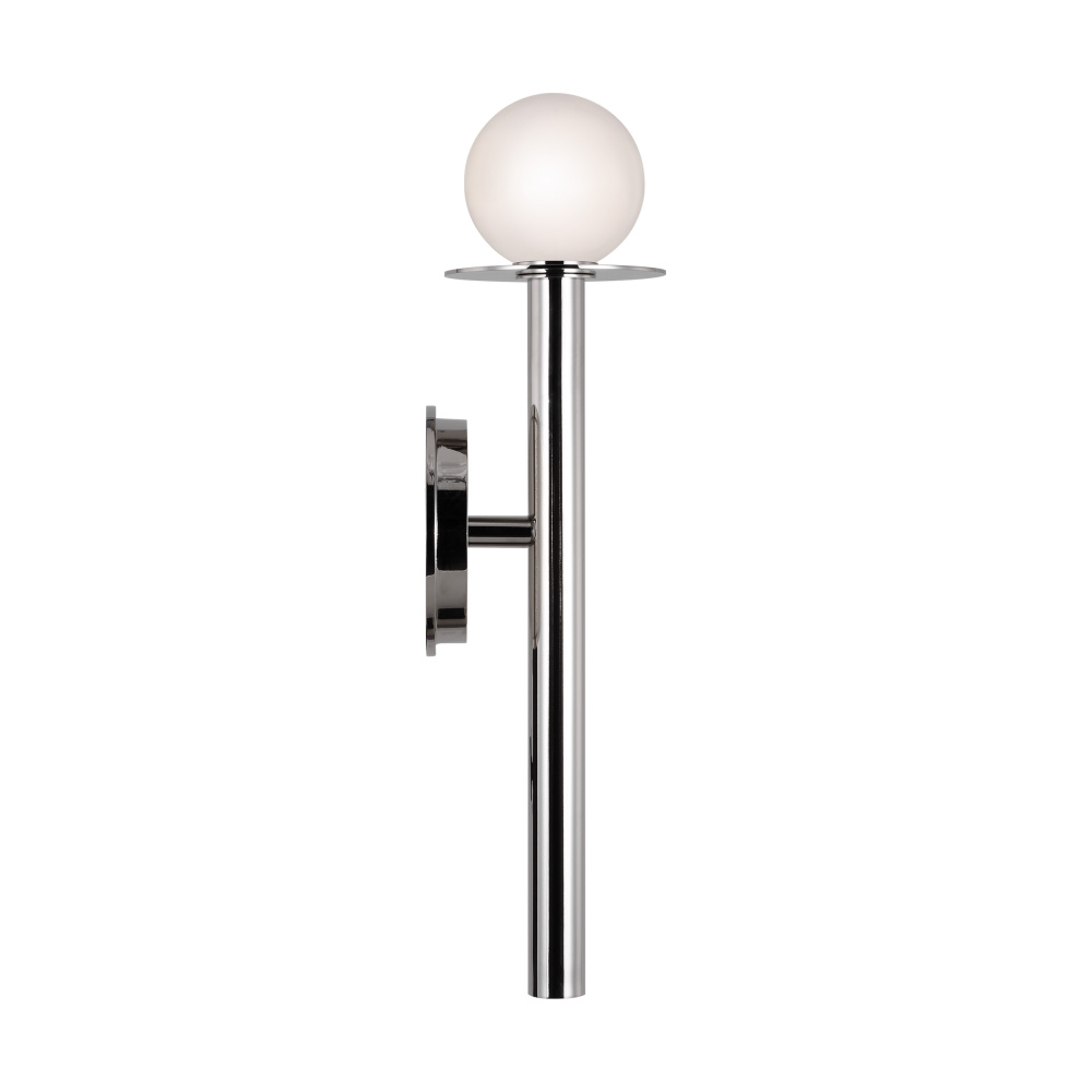 Nodes task, ceiling and wall lighting are minimal yet bold, highlighting Kelly's distinctive juxtaposition of mixed-materiality and curvilinear form. Light radiates from milk glass globes. Hanging fixtures within this family feature black fabric cords, while pivot sconces can be a cord, plug, or hard wire.