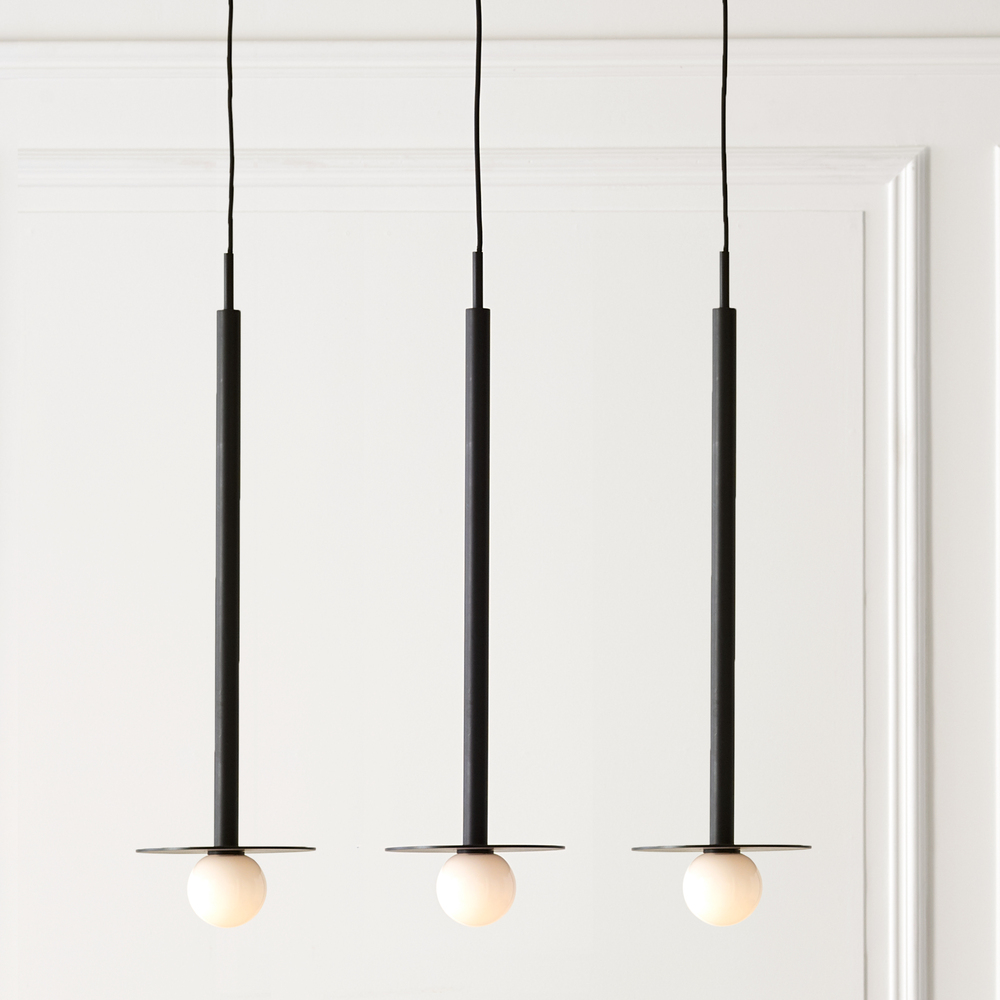 Nodes task, ceiling and wall lighting is minimal yet bold, highlighting Kelly's distinctive juxtaposition of mixed-materiality and curvilinear form. Light radiates from milk glass globes set against metal discs. All fixtures can be used or without the discs. The cast canopy is available in Burnished Brass or Midnight Black. Hanging fixtures within this family feature black fabric cords, while pivot sconces can be cord and plug or hard wire.