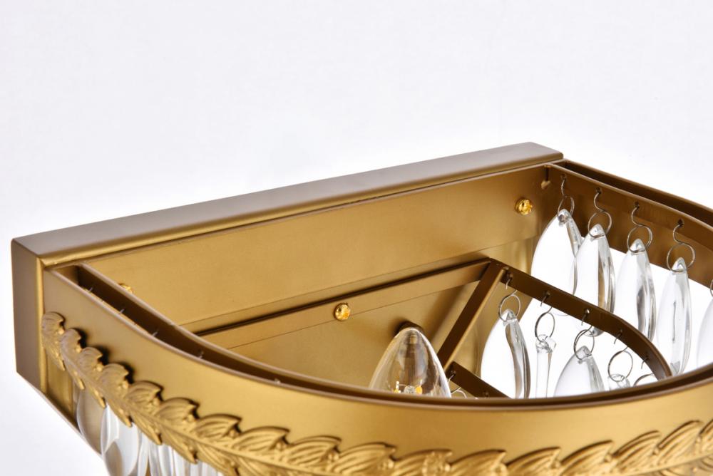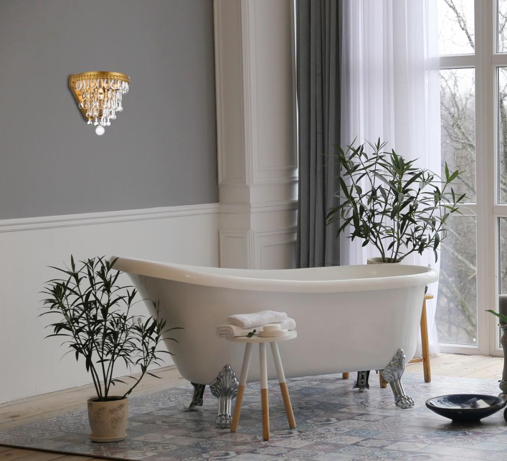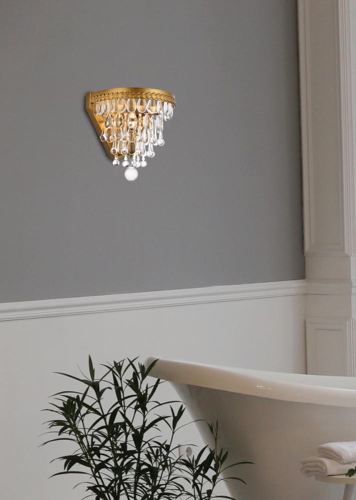 Nordic wall sconces glimmer like droplets of ice on bright winter day. Tiers of clear, royal-cut crystals reflect the soft glow of the candelabra bulb inside. An etched brass frame complements the glistening layers below.
