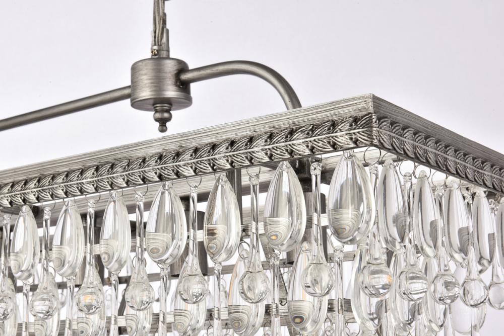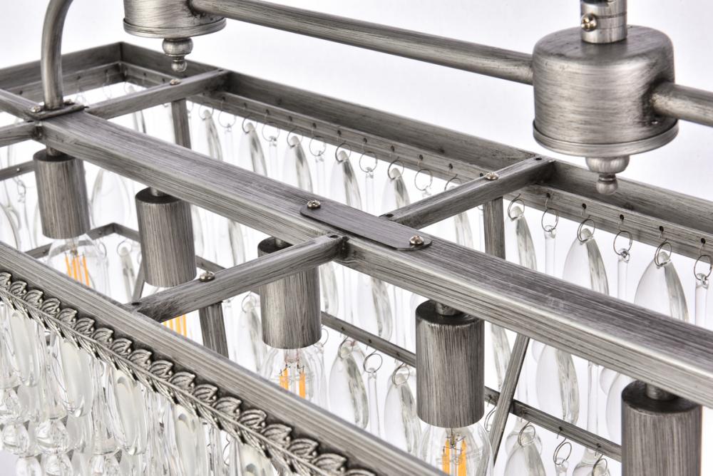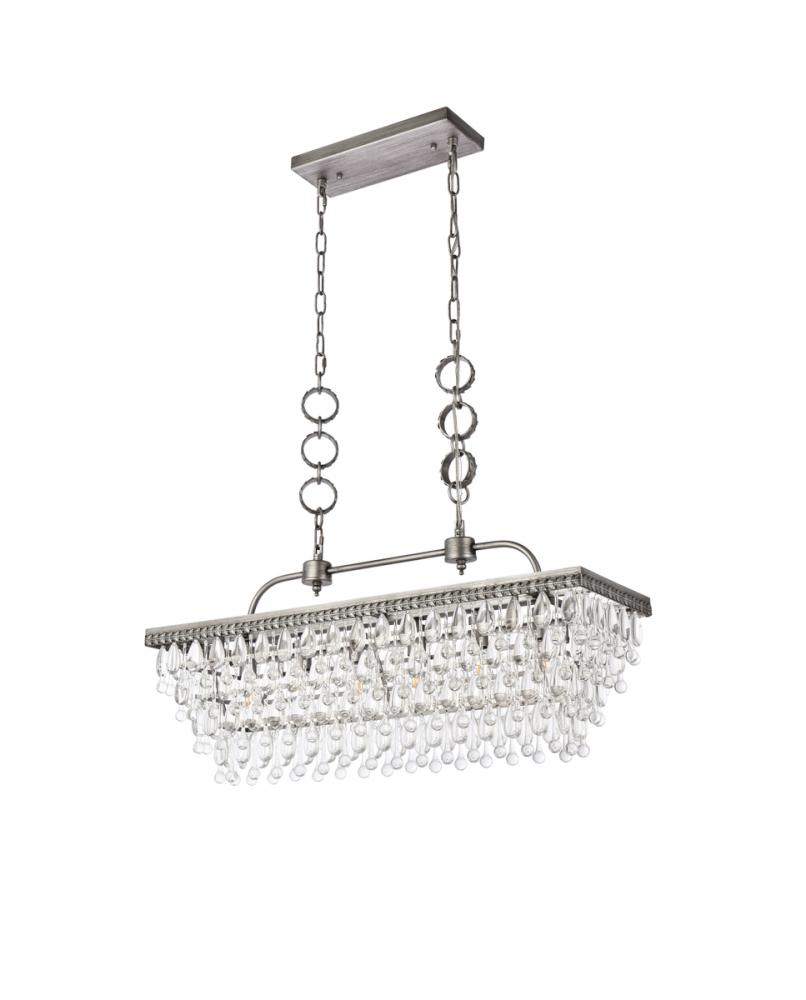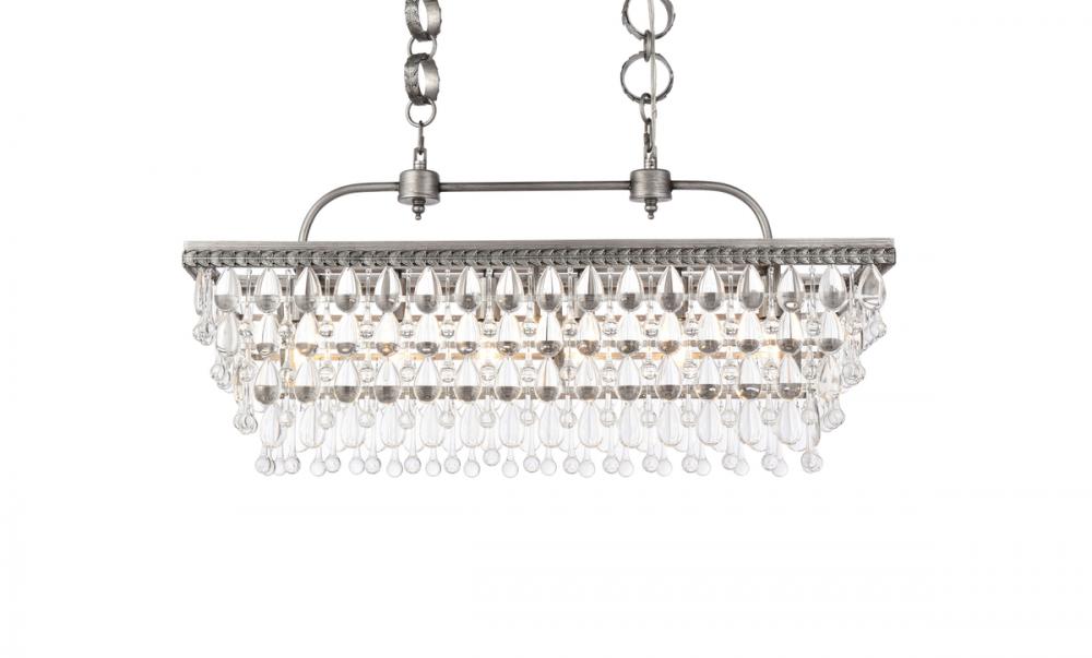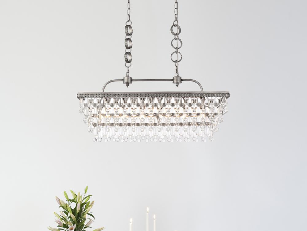 Like the sun setting on a frozen lake, this collection shimmers with tiers of icy crystals reflecting the soft glow of the candelabras. True to its Nordic namesake, the cascades of clear crystals complement the etched metal frame. Suspended by an elegantly looped chain that draws the eye to the cool sheen below. Perfect to place over your dining table.