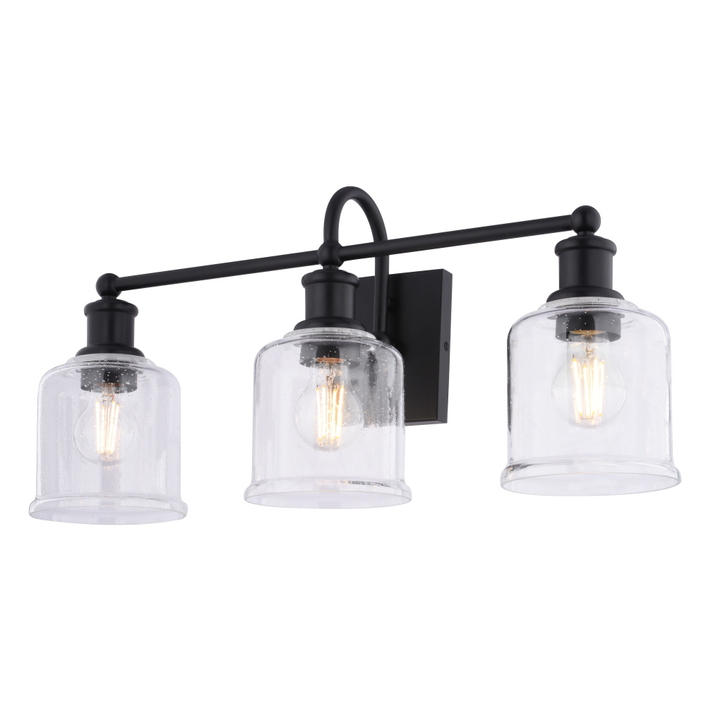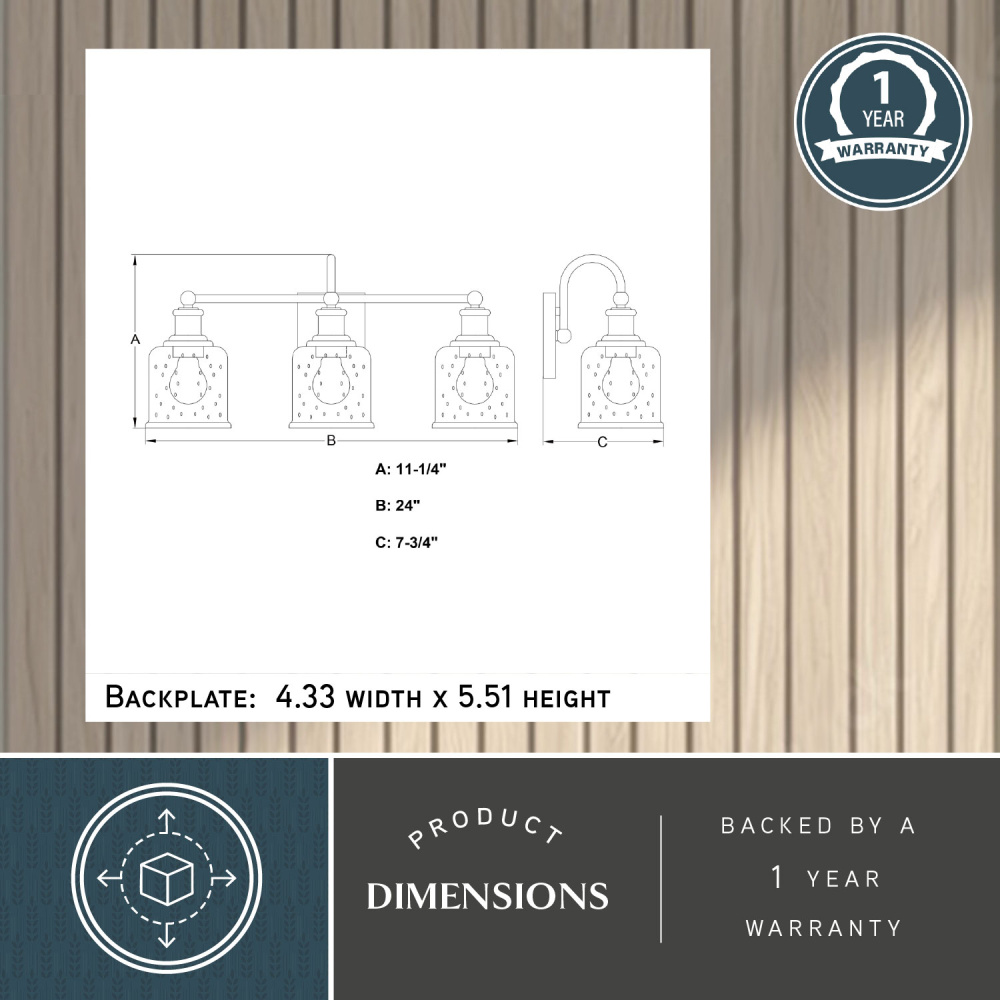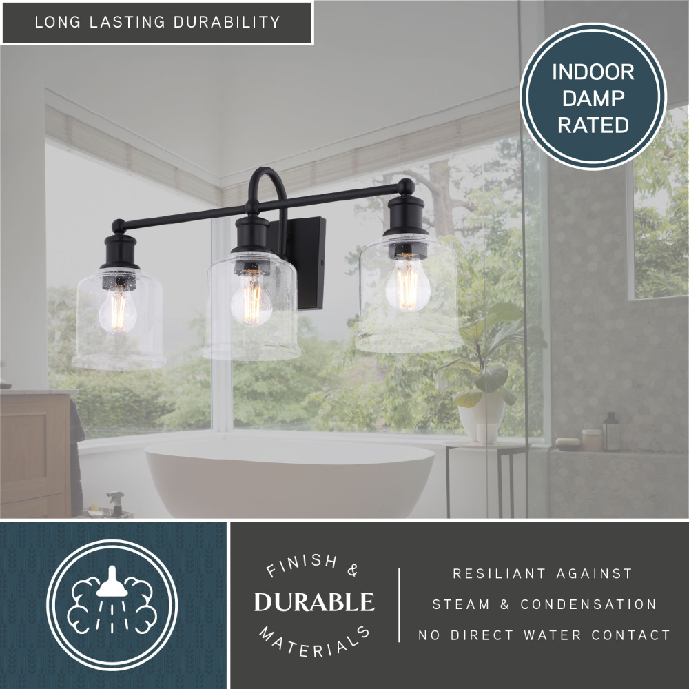 Embrace the charm of cottage core aesthetics with the Northbrook 3-light vanity in a sophisticated matte black finish. The clear seeded glass shades diffuse a warm, inviting light, perfect for creating a cozy and welcoming bathroom ambiance. This wider 24-inch wall fixture design provides ample illumination for larger vanities, while the classic silhouette and traditional details effortlessly complement farmhouse and classic interiors. The damp-rated design ensures lasting beauty, while bringing a touch of vintage elegance and timeless sophistication to your daily routine.
