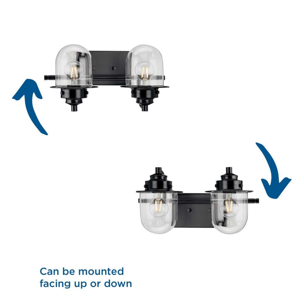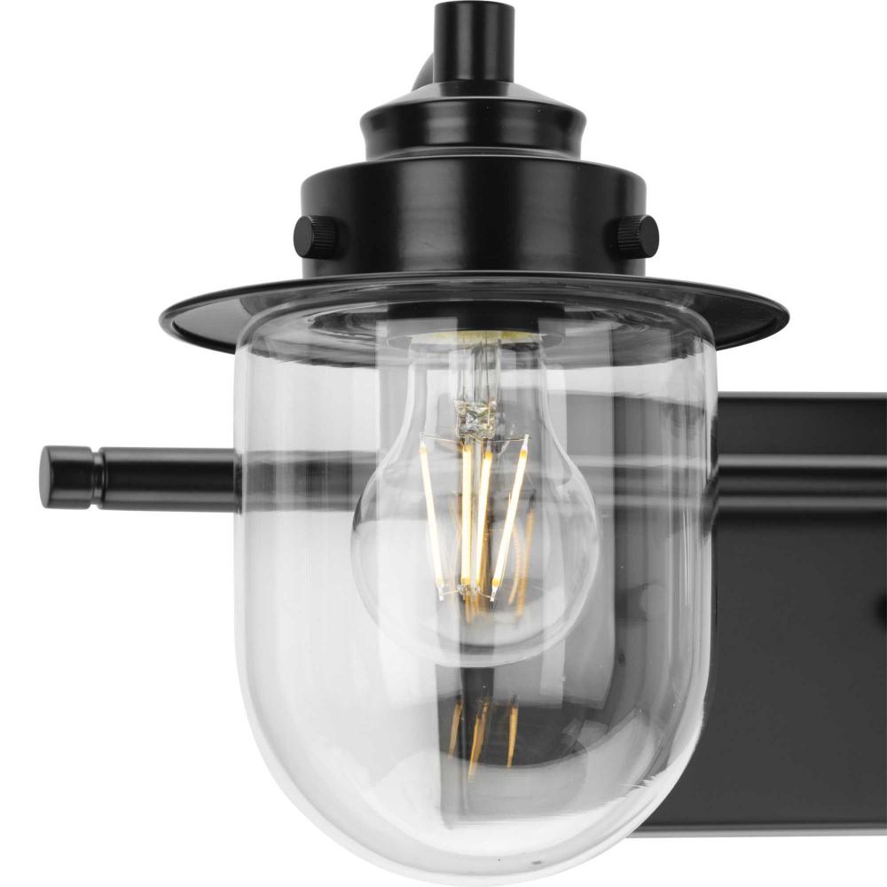 The nostalgic Northlake Collection combines classic design influences with nautical inspiration. Finished in matte black, the rounded diffuser and layered caps are reminiscent of floating buoys and weekends on a mountain lake. Clear glass shades cast a pleasing glow in bathrooms and powder rooms in coastal and transitional settings. This versatile fixture can be mounted up or down, increasing its design flexibility. It is cULus damp rated and has a one-year warranty to guarantee your complete satisfaction. Progress Lighting products offer exceptional quality, reliability, and functionality. .