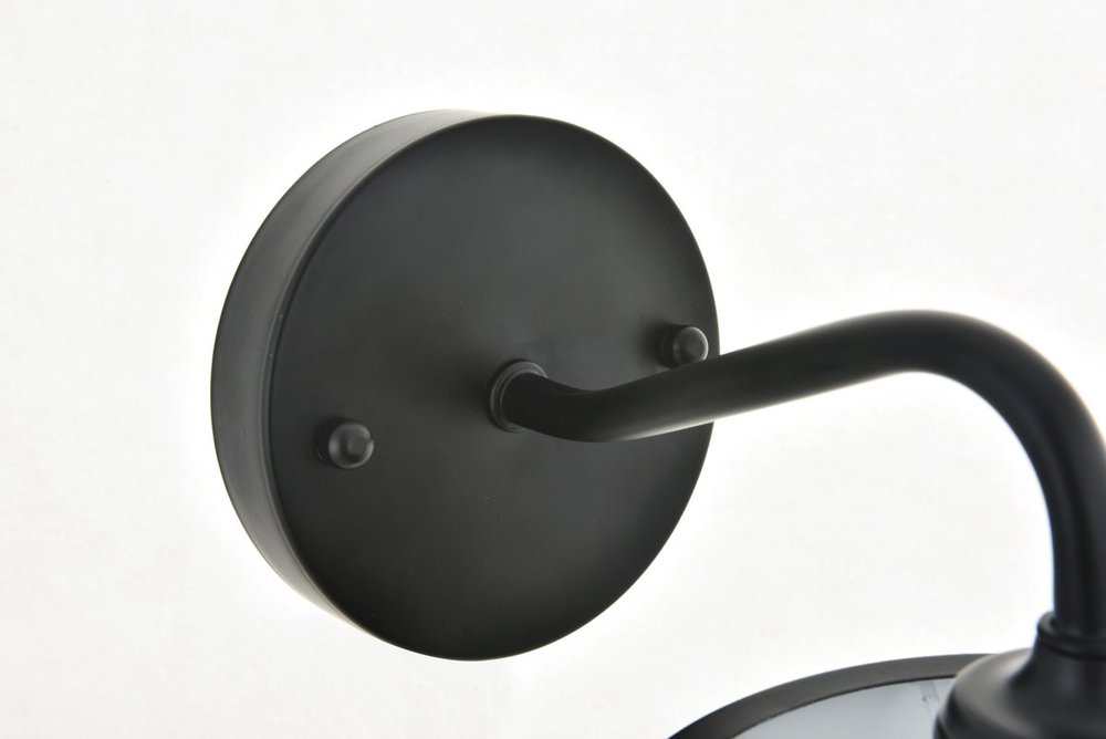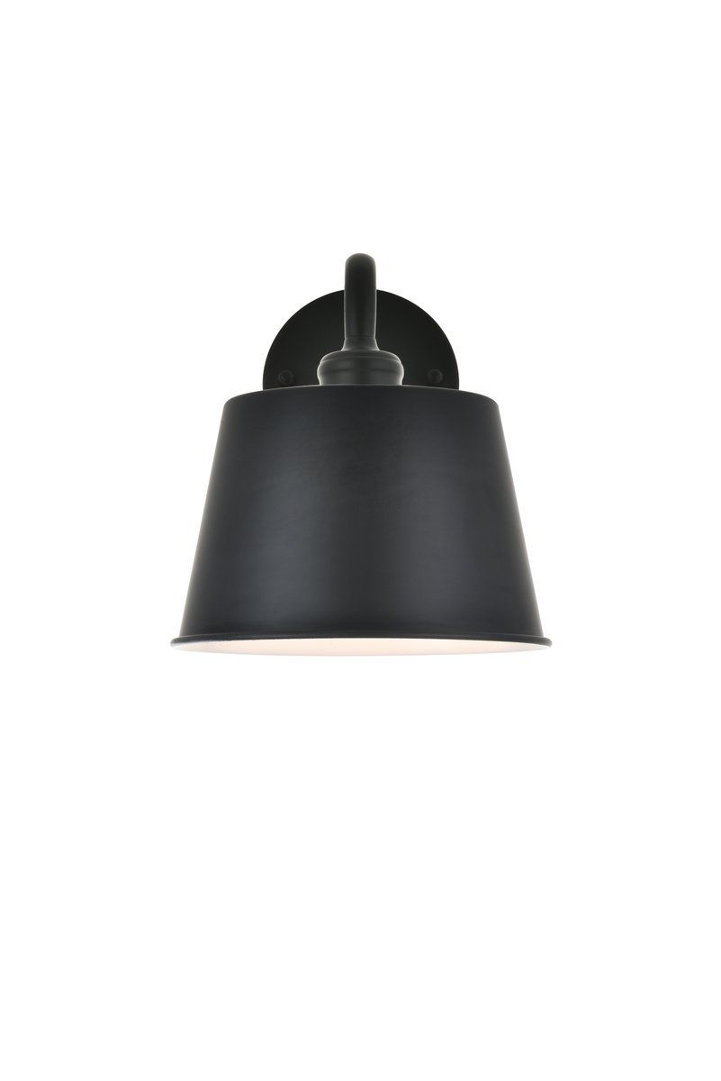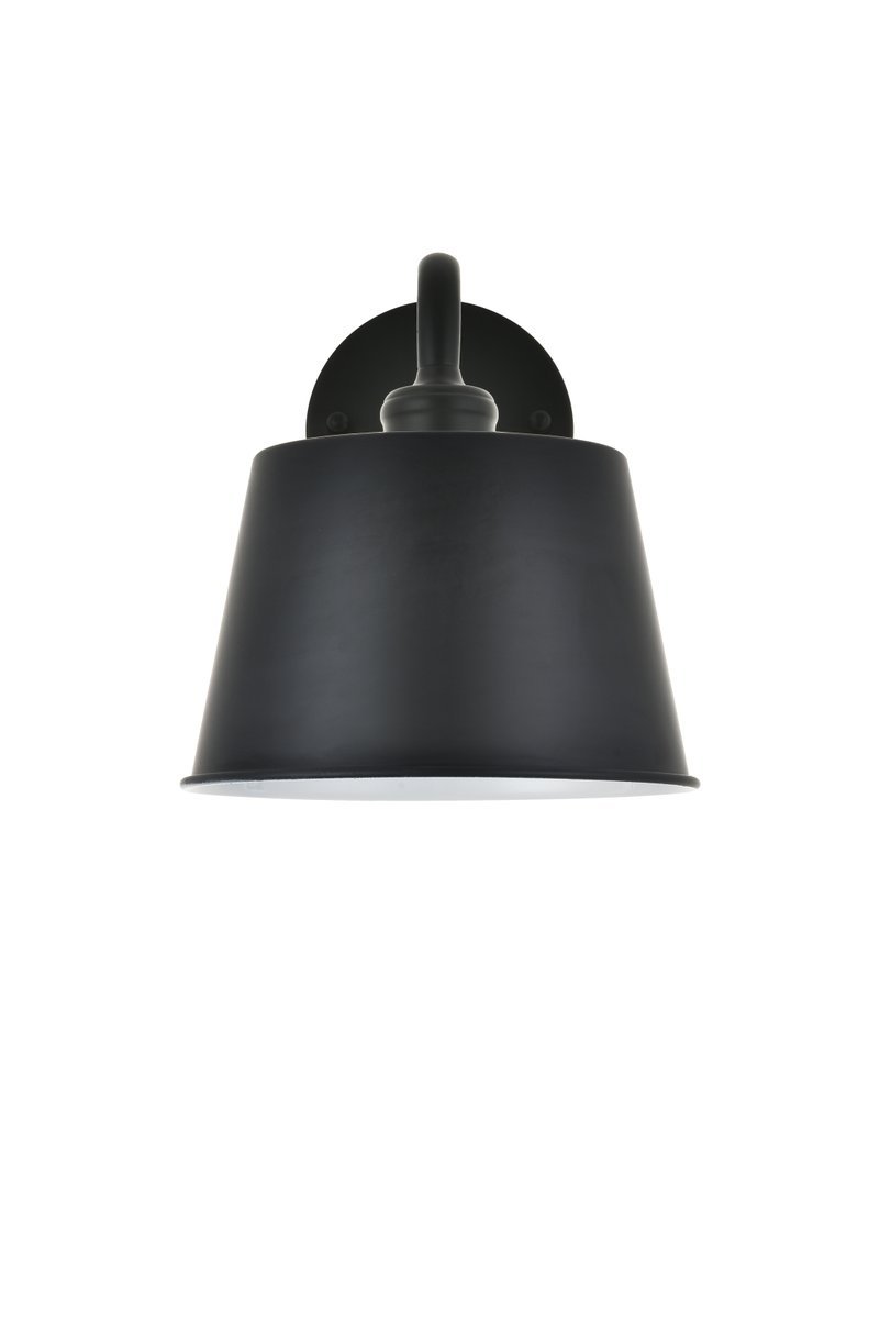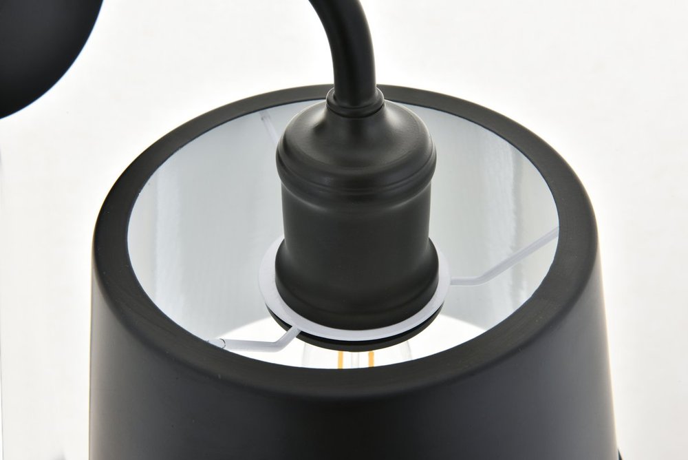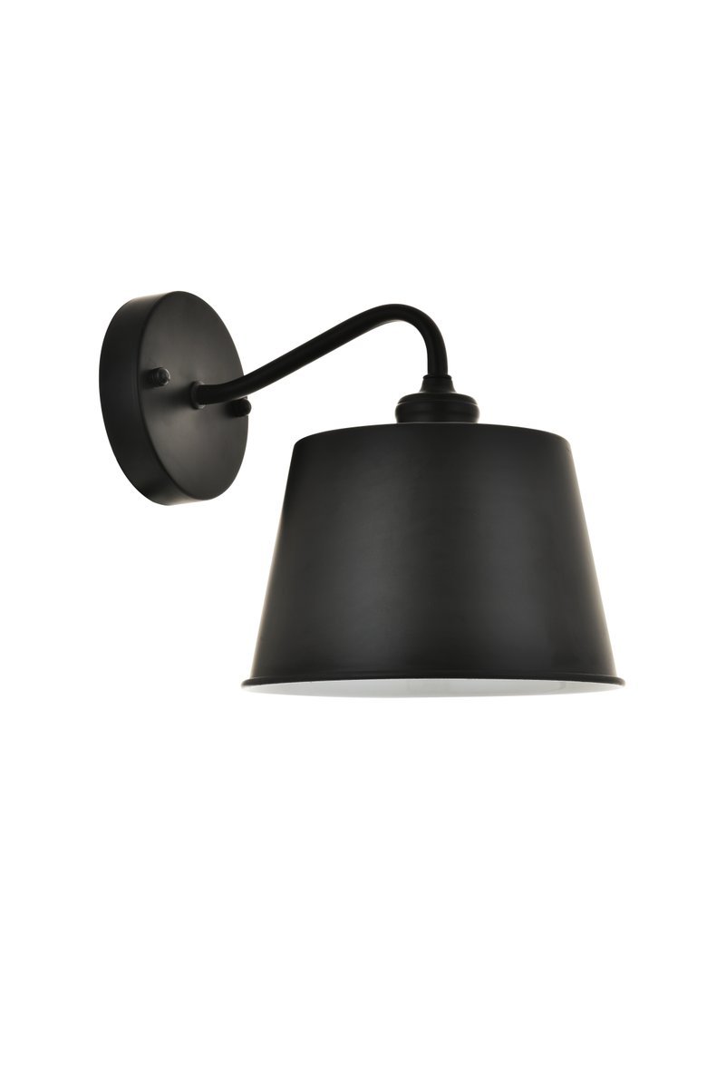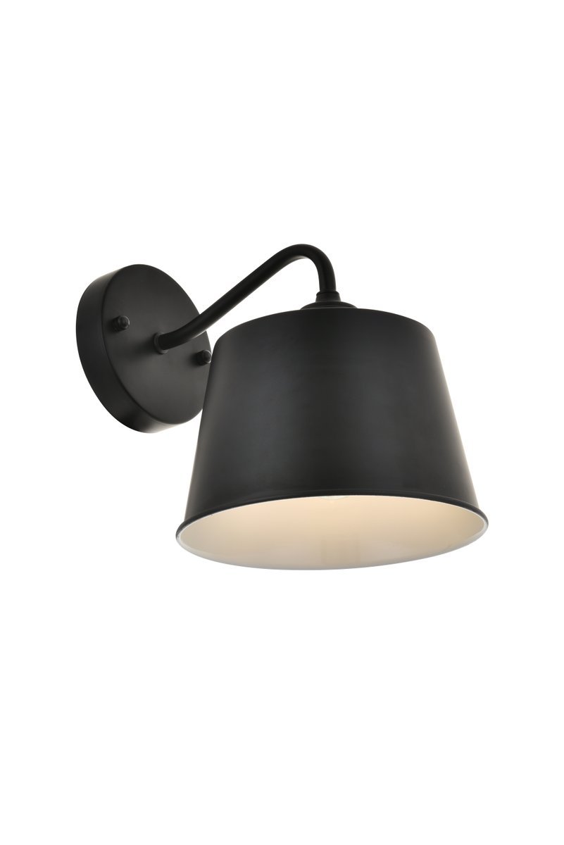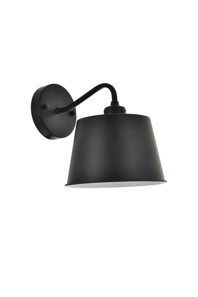 Contemporary and minimalistic black finish wall sconce with a drum shaped shade and gentle curving arm