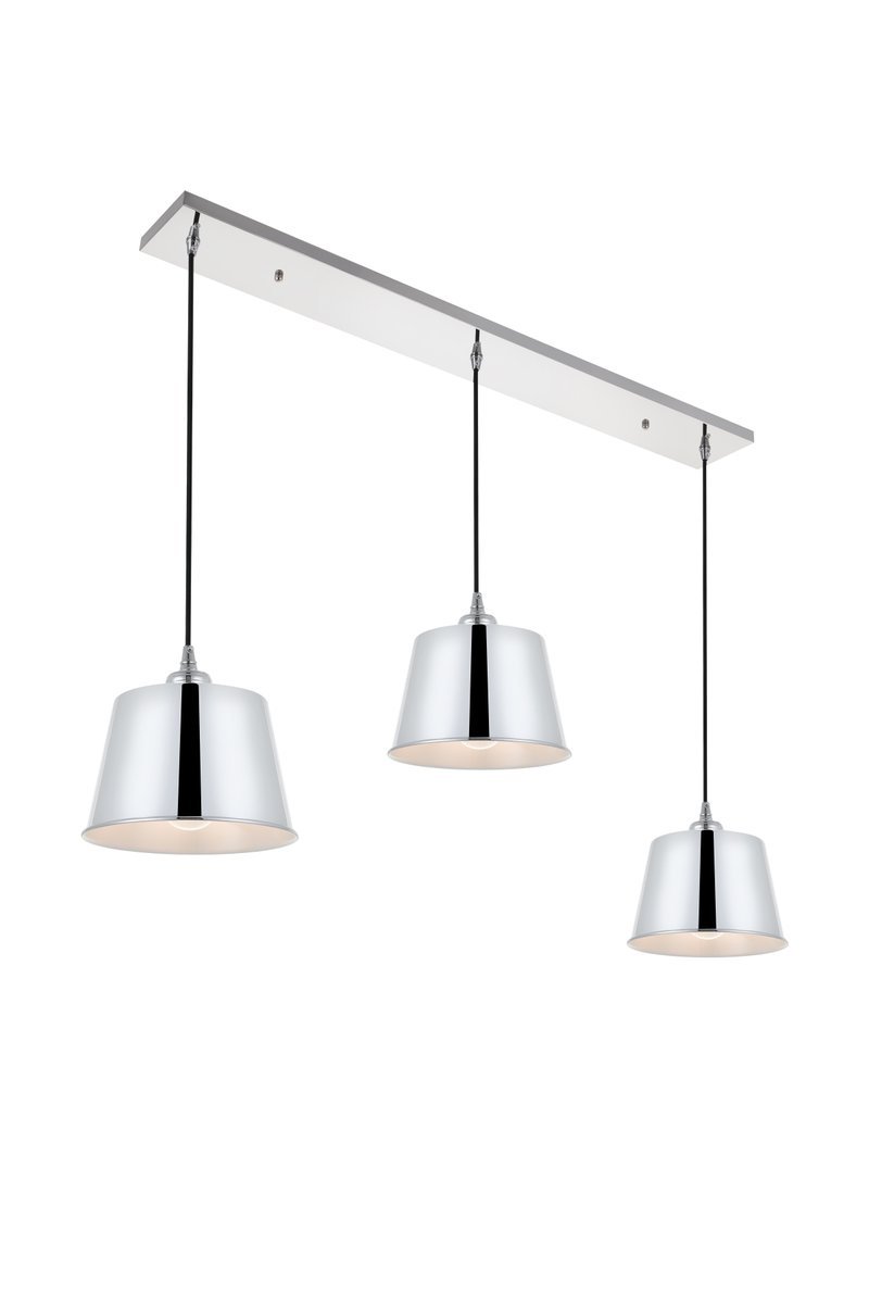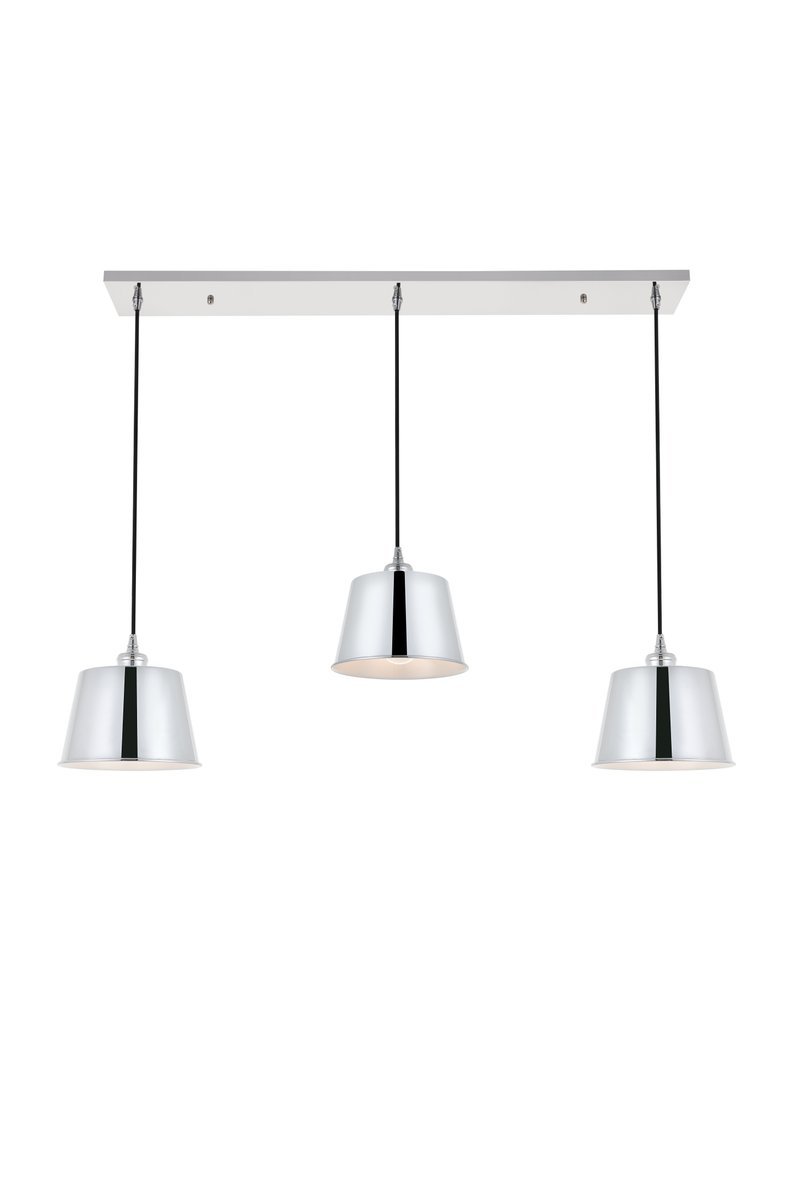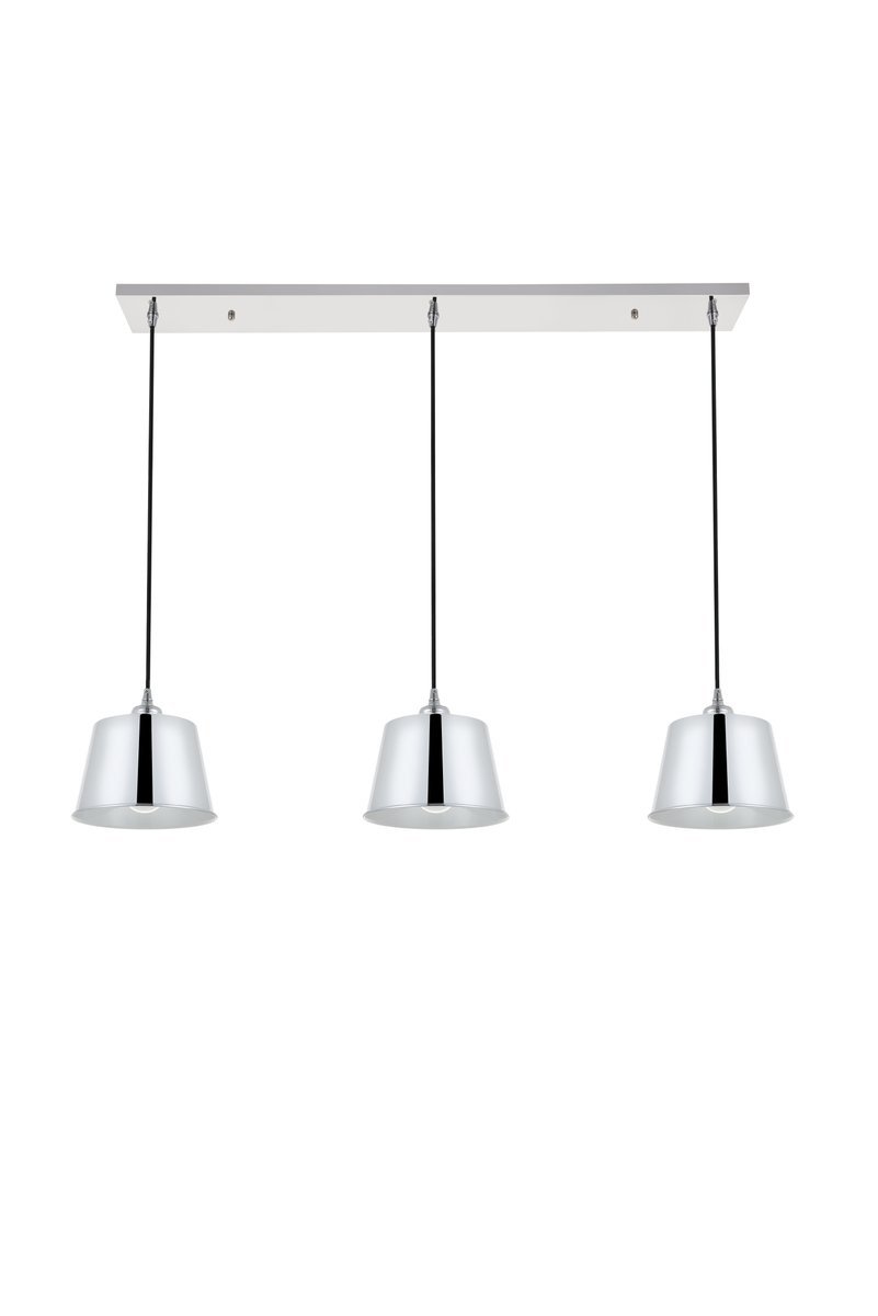 Contemporary and minimalistic chrome finish 3-light pendant light with drum shaped shade suspended from a rectangular canopy