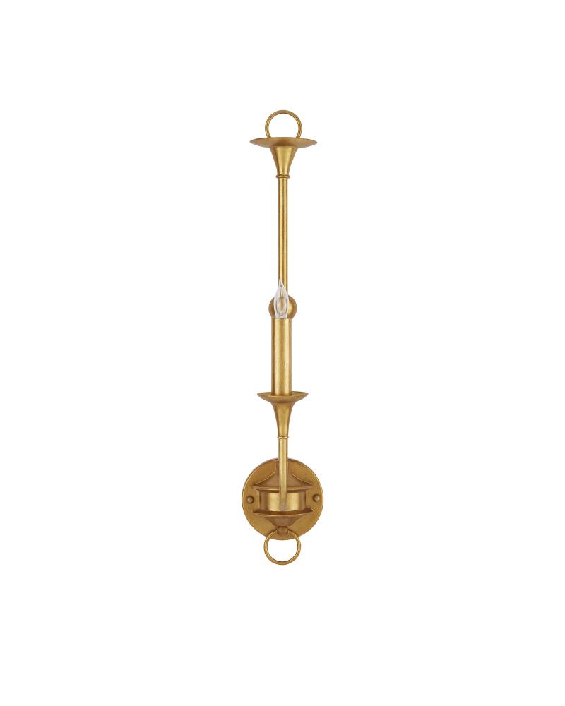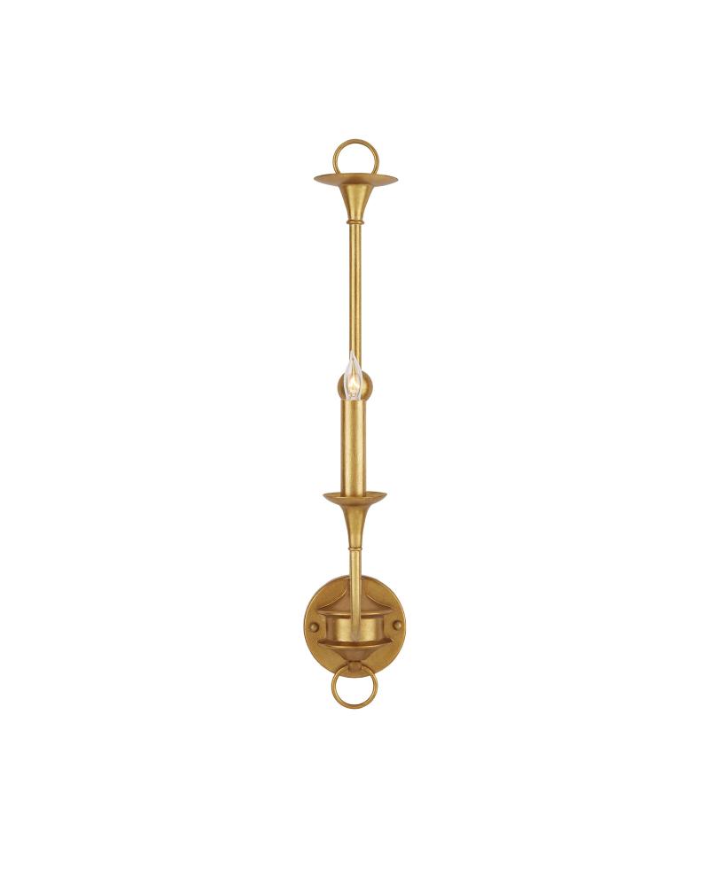 The arm of the Nottaway Gold Wall Sconce stretches gracefully from a half-spool shape that rests at the bottom of its stem, ornamented with a dainty ring. Though this is a seriously minimalist fixture, the profile of the gold wall sconce has a lovely fluidity to it that also makes it a natural choice for traditional and transitional interiors. The contemporary gold leaf finish on the wrought iron frame adds a very subtle textural interest.