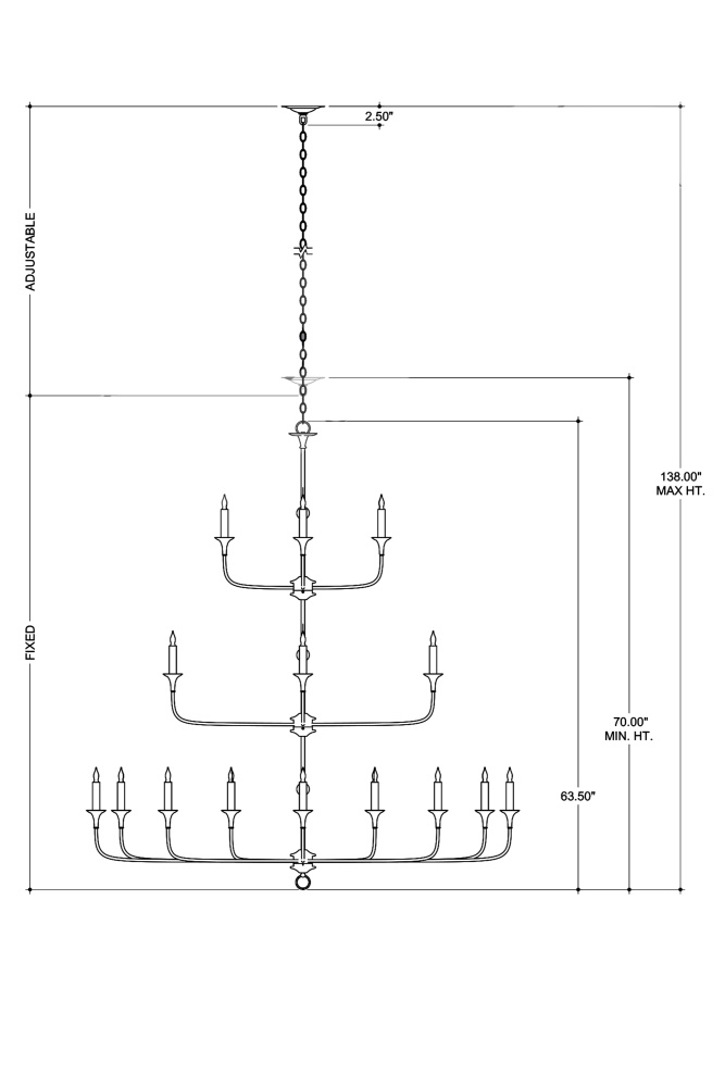 Design notes on the Nottaway Grande Bronze Chandelier include long arms that stretch gracefully from small cogs and a ring that ornaments its bottom-most point. The profile of the fixture has a lovely fluidity to it, and the Pyrite bronze finish adds textural interest to the bronze chandelier. This statuesque chandelier is decidedly in the traditional design category, , but its airiness allows it to function in a range of large rooms. Adjustable from 70" to 138" with use of included chain/rod kit/cable. If your space calls for a longer drop, additional chain/rods/cable is available for purchase.