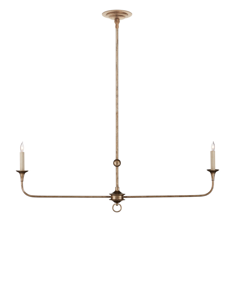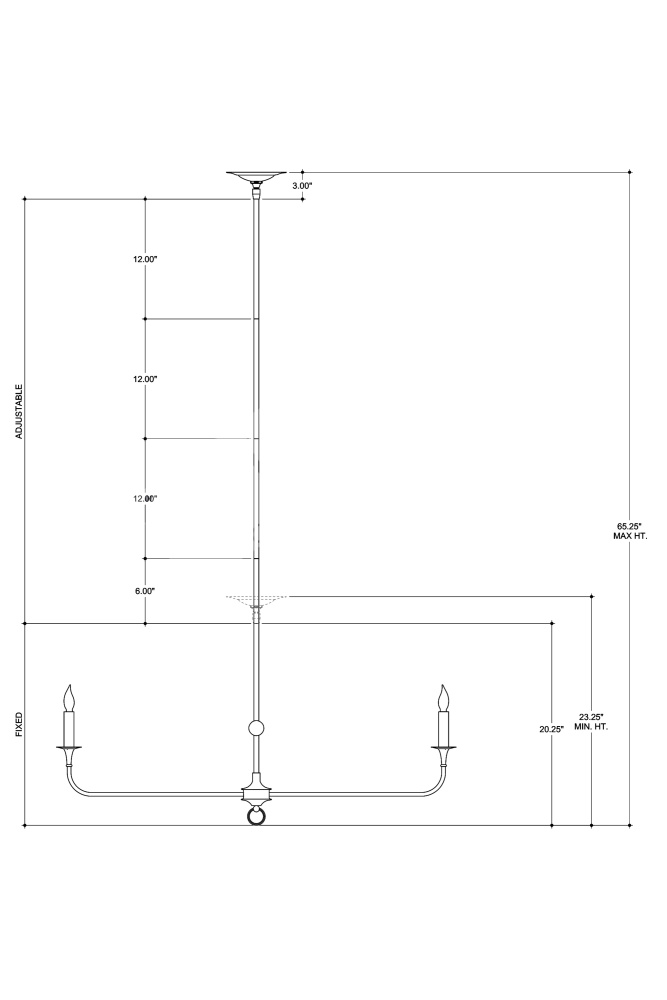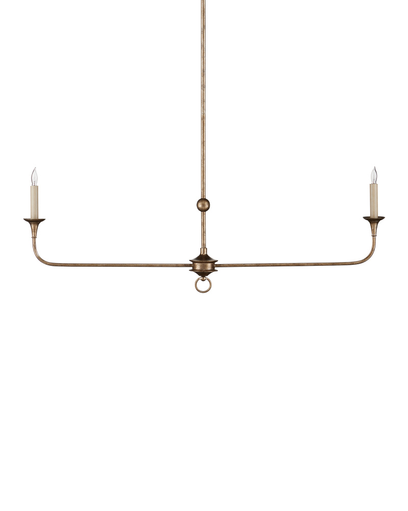 Design notes on the Nottaway Linear Bronze Chandelier include long arms that stretch gracefully from a small cog and a ring that ornaments its bottom-most point. The profile of the fixture has a lovely fluidity to it, and the Pyrite bronze finish adds textural interest to the bronze chandelier. The fact that the chandelier is hung from a rod rather than a chain modernizes this design, though it is still decidedly in the traditional design vernacular. Its shape makes it perfect for above kitchen islands and bars. Adjustable from 23.25" to 65.25" with use of included chain/rod kit/cable. If your space calls for a longer drop, additional chain/rods/cable is available for purchase.