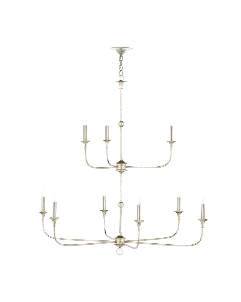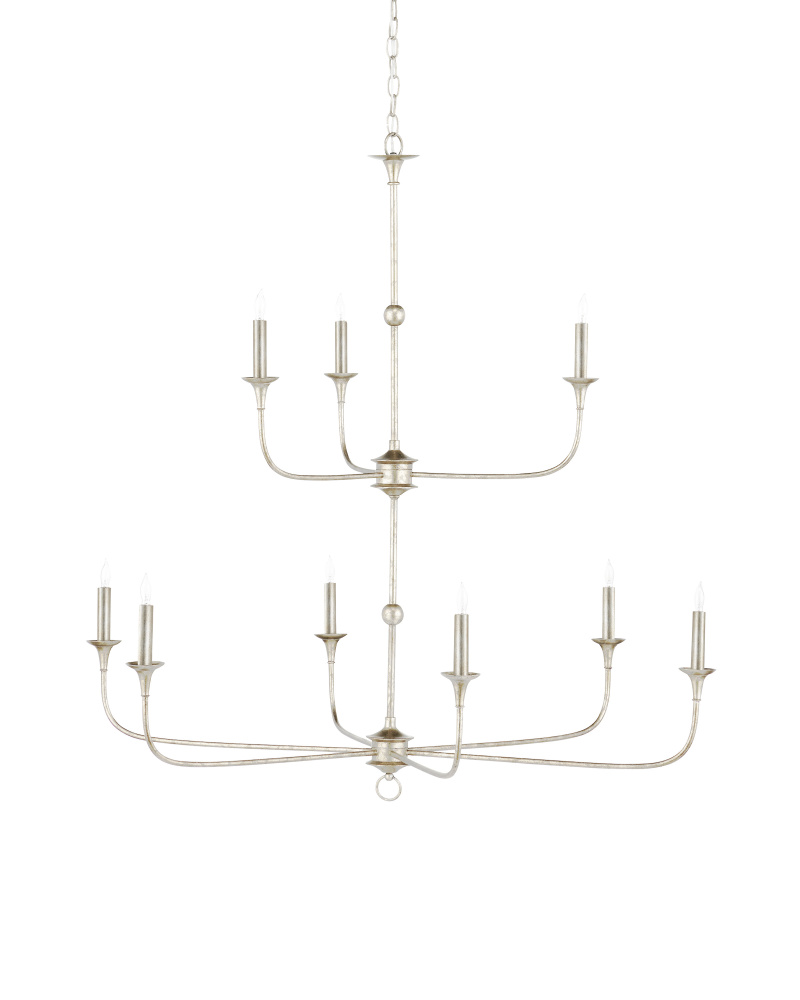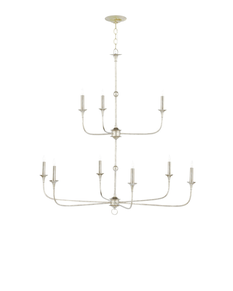 The arms of the Nottaway Two-Tier Champagne Chandelier stretch gracefully from petite cogs that rest at the bottoms of its stems, the bottom one ornamented with a dainty ring. Though the silver chandelier has minimalist lines, there is a sweeping fluidity to its profile that makes it a natural choice for large tall foyers or any room with high ceilings. The finish on the wrought iron frame brings textural interest to this dimmable nine-light fixture. Adjustable from 51" to 119" with use of included chain/rod kit/cable. If your space calls for a longer drop, additional chain/rods/cable is available for purchase.