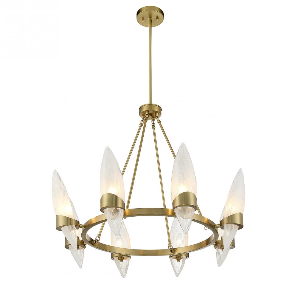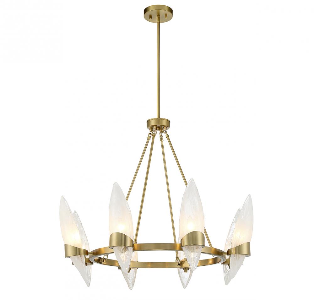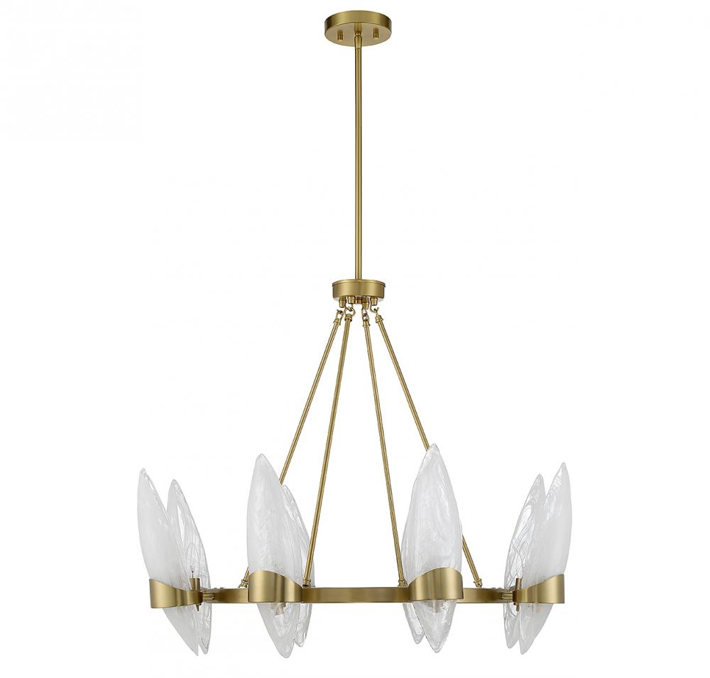 With its petals of handmade strie glass and warm brass finish, the Savoy House Nouvel 8-light chandelier blossoms like a gorgeous Art Deco-meets-contemporary flower. It will create a stunning focal point in any space. Nouvel is 31" in diameter and has an adjustable height ranging from 27.5" to 81". Comes with four 12" downrods and one 6" downrod. It uses 8 candelabra size bulbs of up to 60 watts per bulb (bulbs not included).