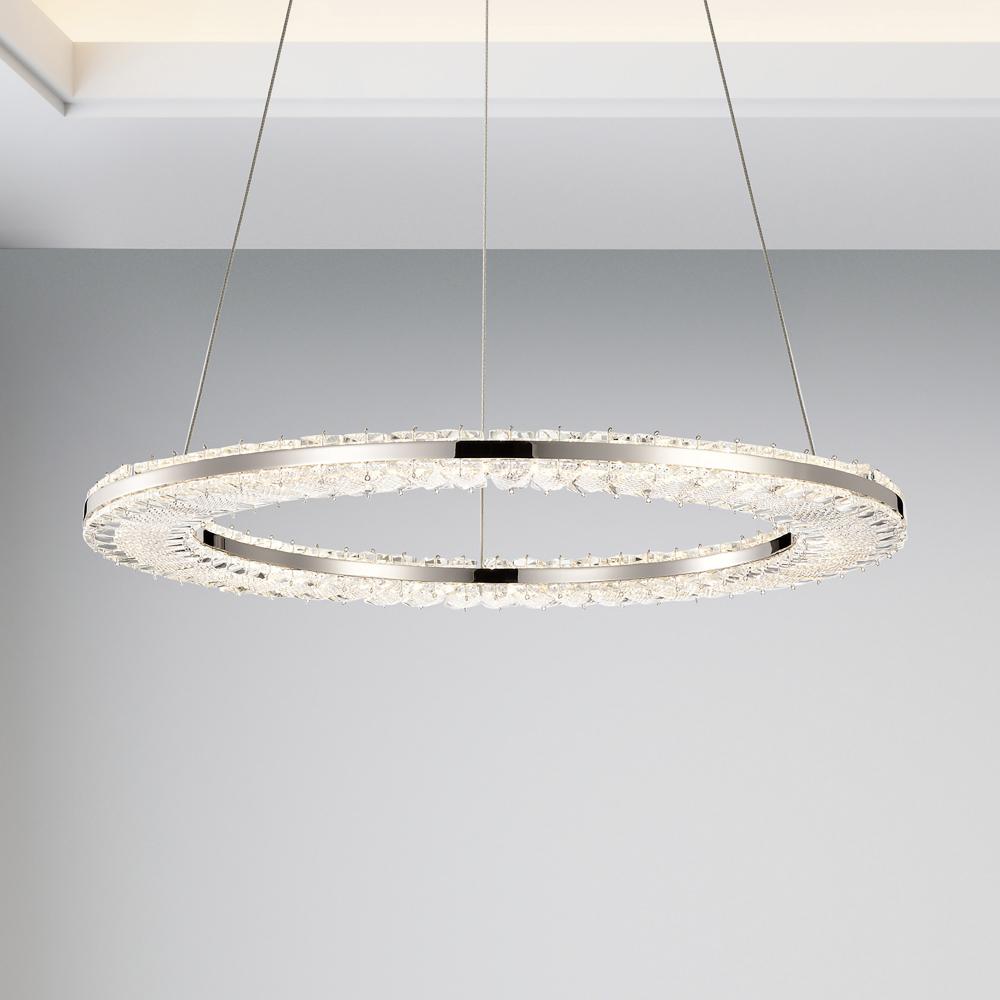 Encounter the Nova 62-2446 LED round pendant, where contemporary crystal design meets classic elegance. Crafted with luxurious K9 crystal, each piece shines with exquisite clarity, casting a radiant glow throughout your space. Finished in polished nickel,
