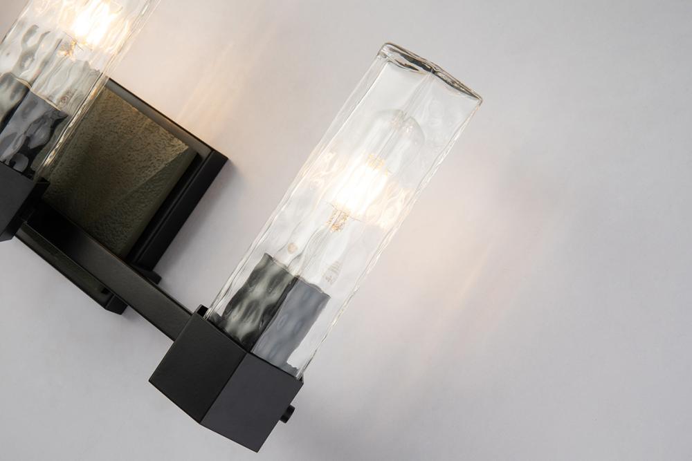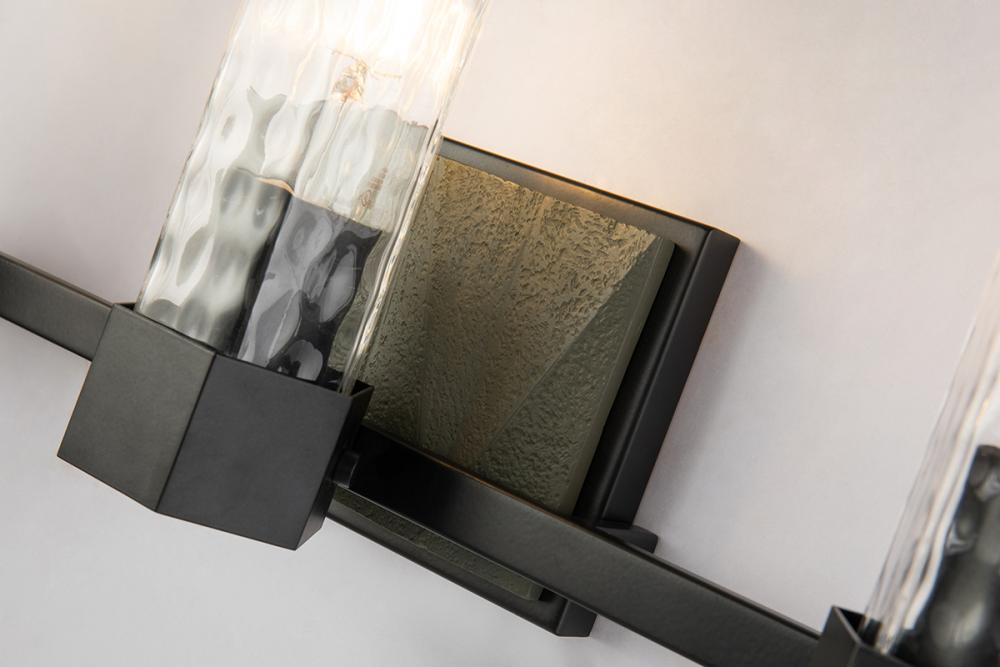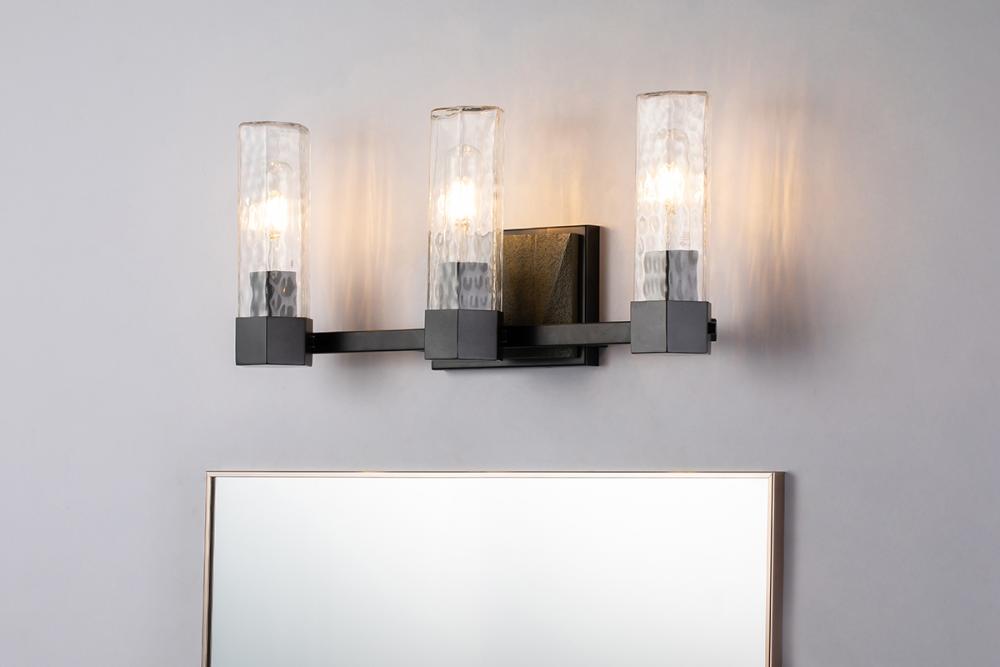 A 21" x 9" x 4.5" black metal 3-light vanity with a grey textured backplate and water glass shades. Perfect for damp bathrooms with warm, stylish light.
