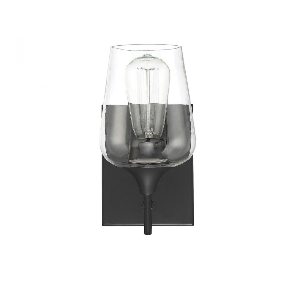 The Octave 1-light sconce from Savoy House has understated elegance. It features a large curved shade of clear glass, minimal detailing and a matte black finish. It may be mounted as either uplight or downlight. Sconces add a touch of style and light to any wall, including but certainly not limited to hallways, entryways, stairways, great rooms and dining rooms. You will also often see a pair of sconces flanking a bathroom vanity mirror to provide an even, flattering wash of light. Because the bulb is exposed, try using a stylized bulb (not included) such as Edison for a different look! The matte black finish can be paired with black hardware or mixed with hardware in other fixtures. Try the Octave with glam, transitional or contemporary style rooms for a chic look. When you choose a Savoy House lighting fixture, you can be certain you've selected a piece that will withstand the test of time.