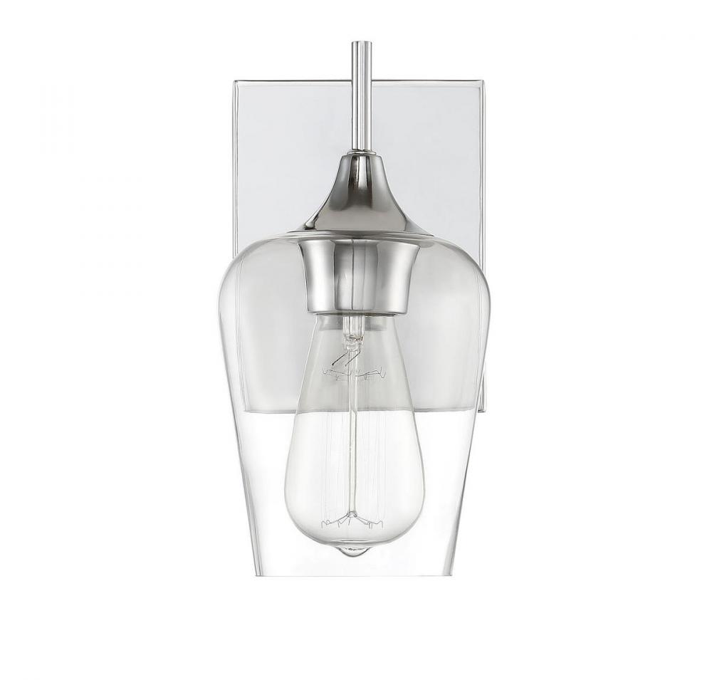The Octave 1-light sconce from Savoy House has understated elegance. It features a large curved shade of clear glass, minimal detailing and a polished chrome finish. It may be mounted as either uplight or downlight. Sconces add a touch of style and light to any wall, including but certainly not limited to hallways, entryways, stairways, great rooms and dining rooms. You will also often see a pair of sconces flanking a bathroom vanity mirror to provide an even, flattering wash of light. Because the bulb is exposed, try using a stylized bulb (not included) such as Edison for a different look! The polished chrome finish can be paired with chrome hardware or mixed with hardware in other fixtures. Try the Octave with glam, transitional or contemporary style rooms for a chic look. When you choose a Savoy House lighting fixture, you can be certain you've selected a piece that will withstand the test of time.