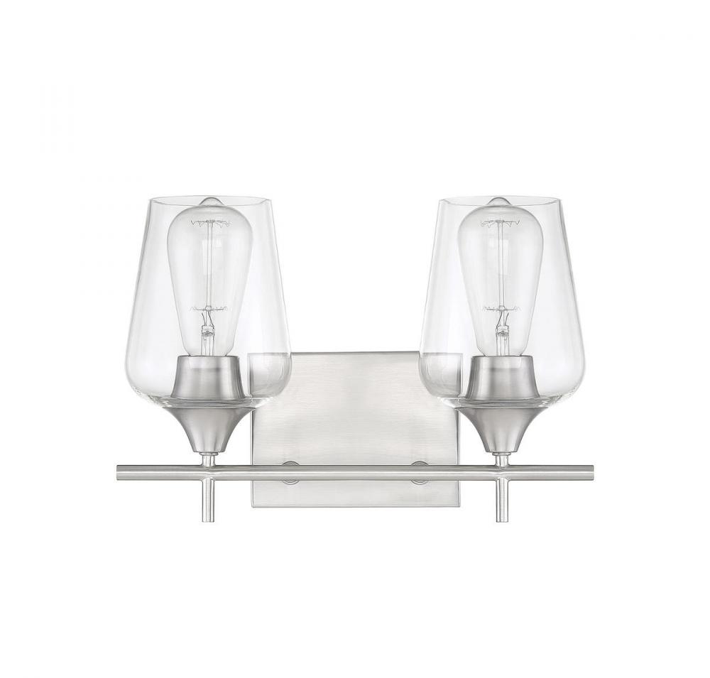 In the Savoy House Octave 2-light bath bar, bold light-colored lines and a streamlined silhouette create an air of elegance and sophistication. The satin nickel finish and clear glass shades go with absolutely everything. Whether you have transitional, contemporary, bohemian or other decor styles in your bath, you’ll love the way this Octave fixture stylishly blends in. The bath bar is 13.75" wide, 9.5" high and extends 5.5" from the wall. The curved glass shades have a graceful, uncluttered look and two 60W standard size bulbs provide lovely light above the vanity. Plus, it may be mounted as either uplight or downlight, creating a sleek and clean choice for your bathroom or powder room.