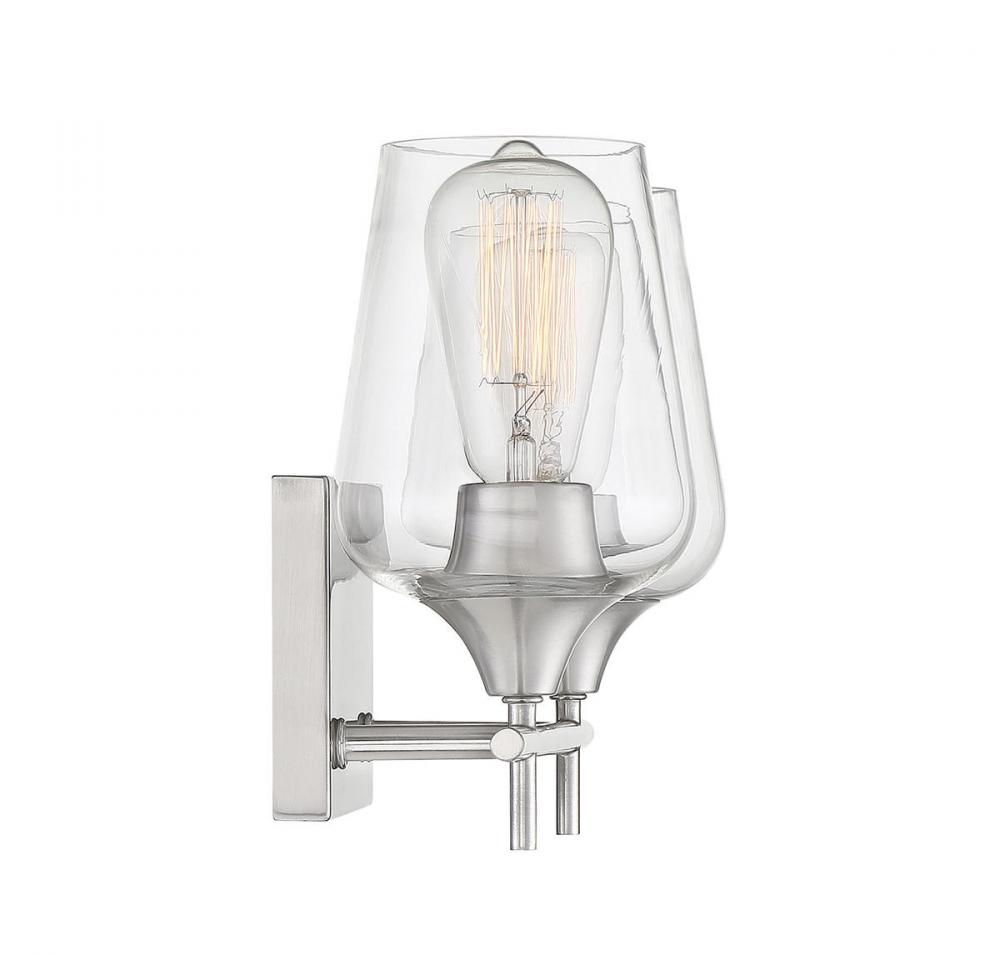 Bold, light-colored lines and a streamlined silhouette create an air of elegance and sophistication. The lustrous, brushed, satin nickel finish and clear glass shades go with absolutely everything: any color palette and many other finishes. Whether you have transitional, contemporary, bohemian, or other decor styles in your bath, you’ll love the way this Octave fixture stylishly blends in. The bath bar is 14” wide, 9” high, and extends 5.5” from the wall. The curved glass shades have a graceful, uncluttered look, and two 60W, E-style bulbs provide lovely light above the vanity. Plus, it may be mounted as either uplight, or downlight —a sleek, clean choice for your bathroom or powder room.