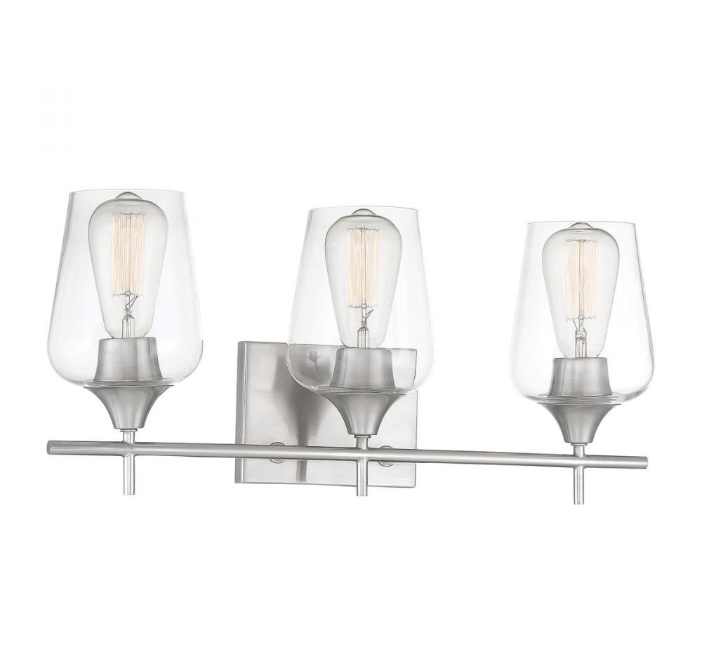 Bold, light-colored lines and a streamlined silhouette create an air of elegance and sophistication. The lustrous, brushed, satin nickel finish and clear glass shades go with absolutely everything: any color palette and many other finishes. Whether you have transitional, contemporary, bohemian, or other decor styles in your bath, you’ll love the way this Octave fixture stylishly blends in. The bath bar is 21” wide, 9” high, and extends 5.5” from the wall. The curved glass shades have a graceful, uncluttered look, and three 60W, E-style bulbs provide lovely light above the vanity. Plus, it may be mounted as either uplight, or downlight —a sleek, clean choice for your bathroom or powder room.