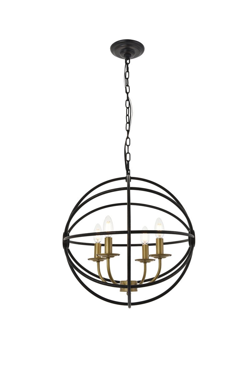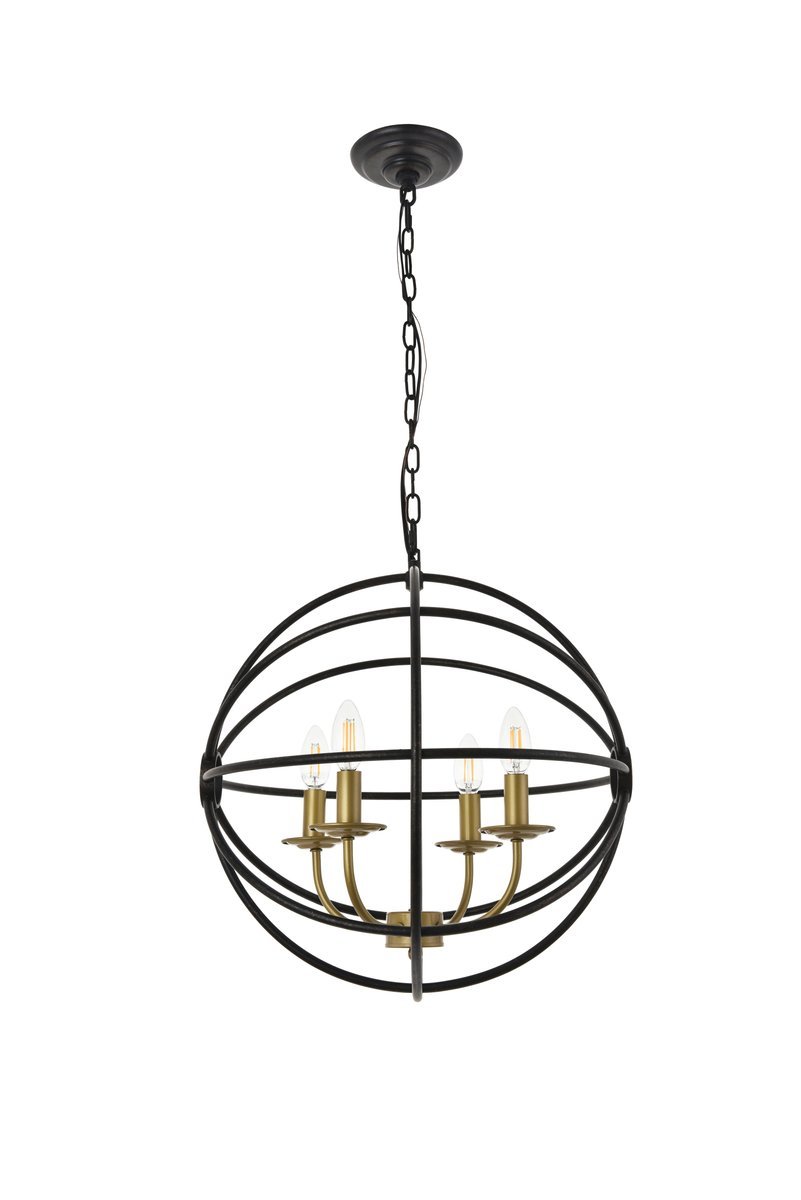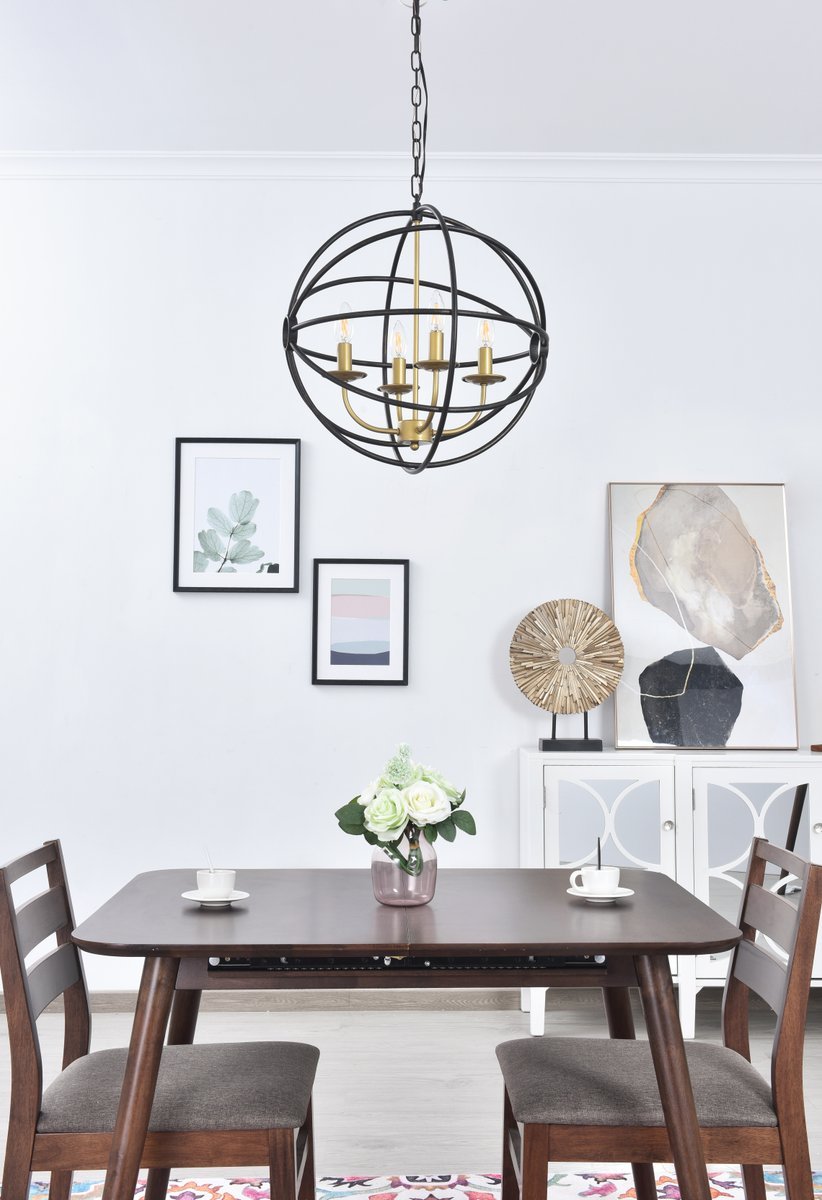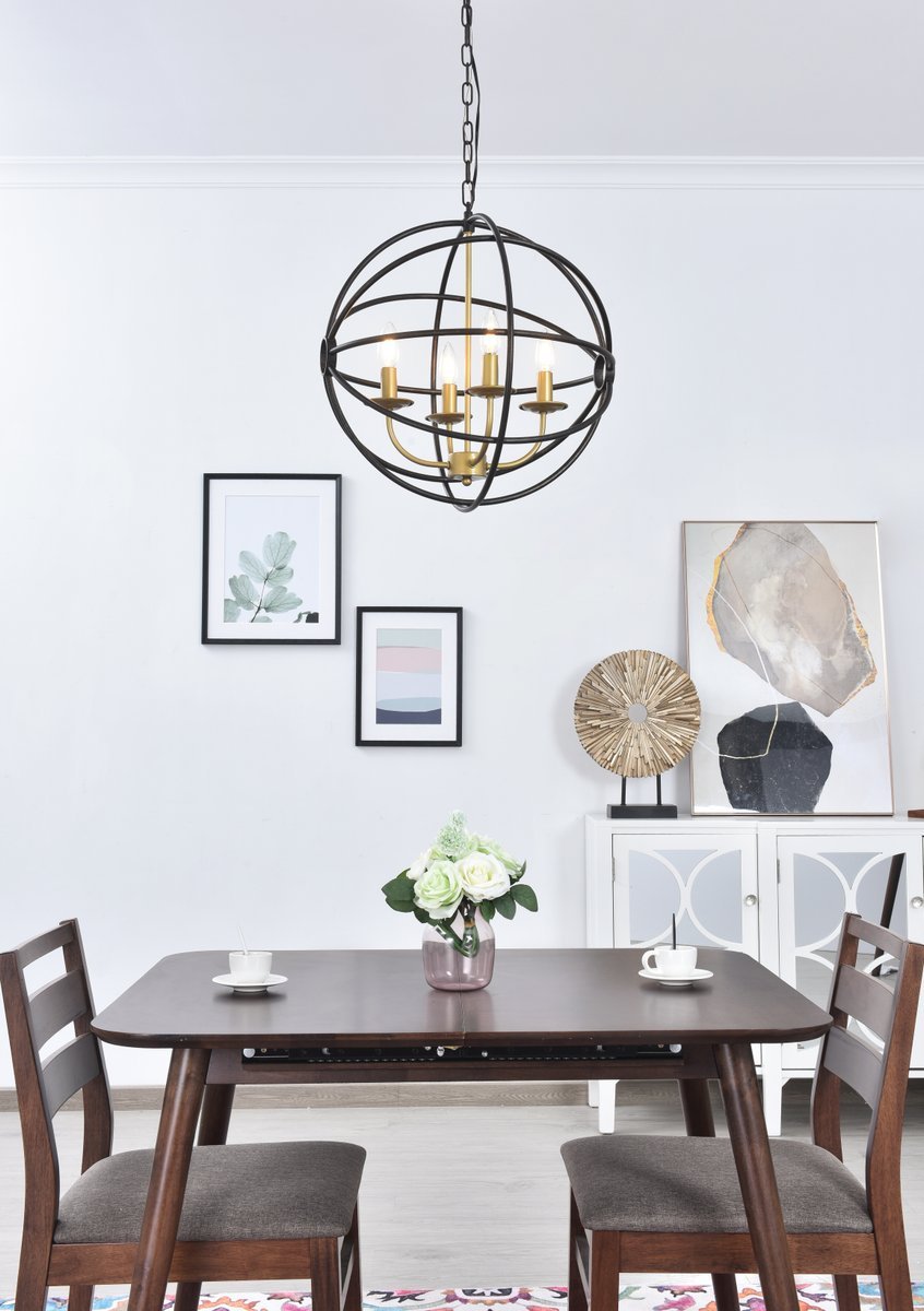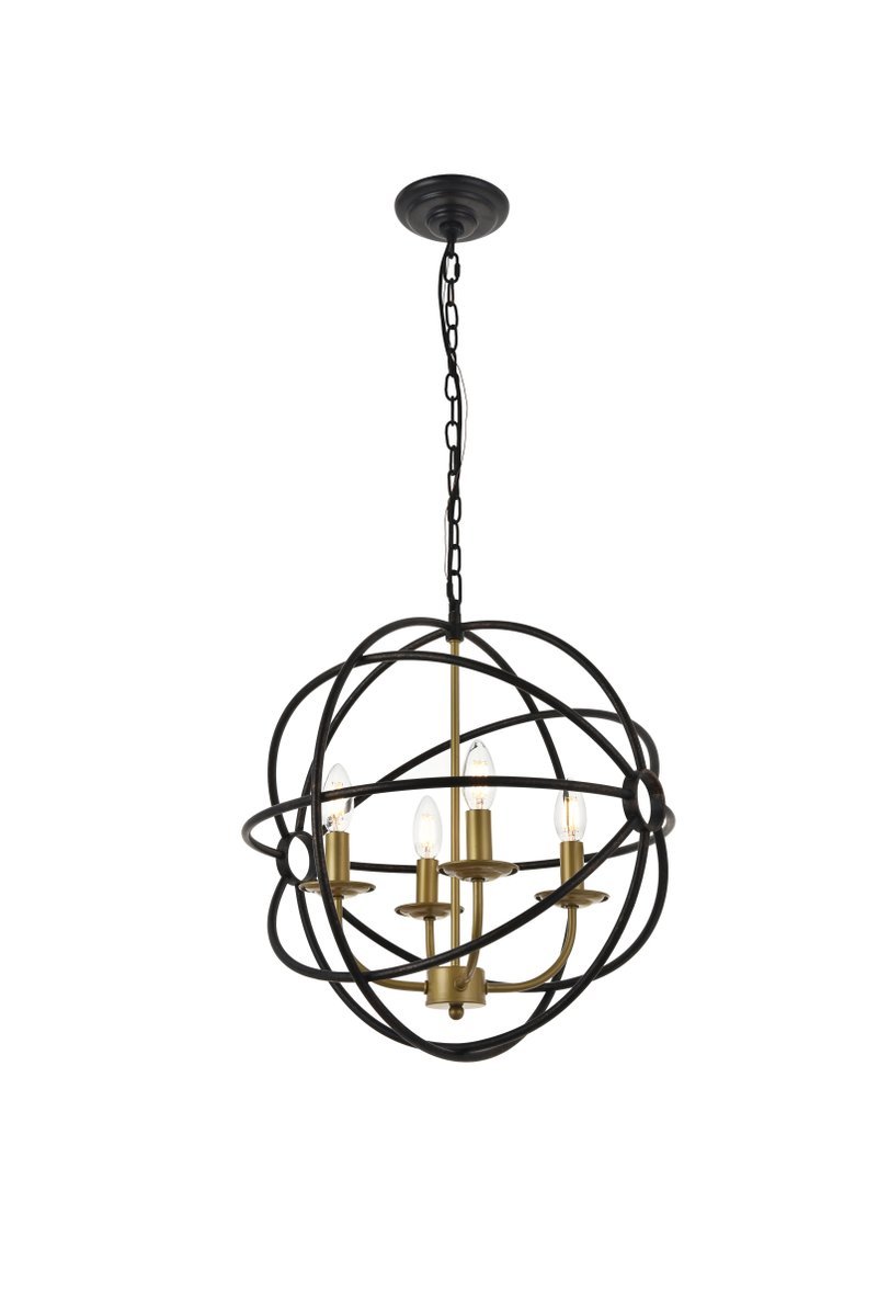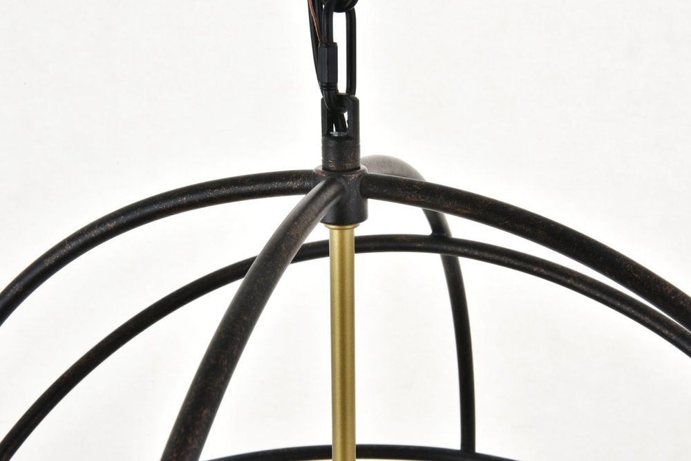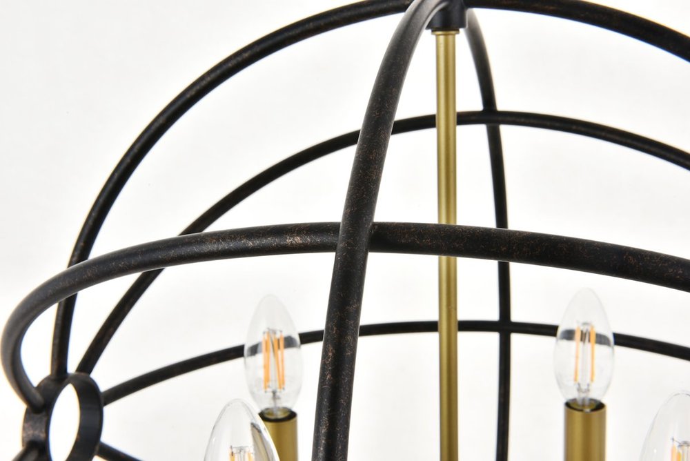 Two-toned brass and dark brown finish open gyroscopic frame with 4 candelabra styled lights within, giving off an old world charm