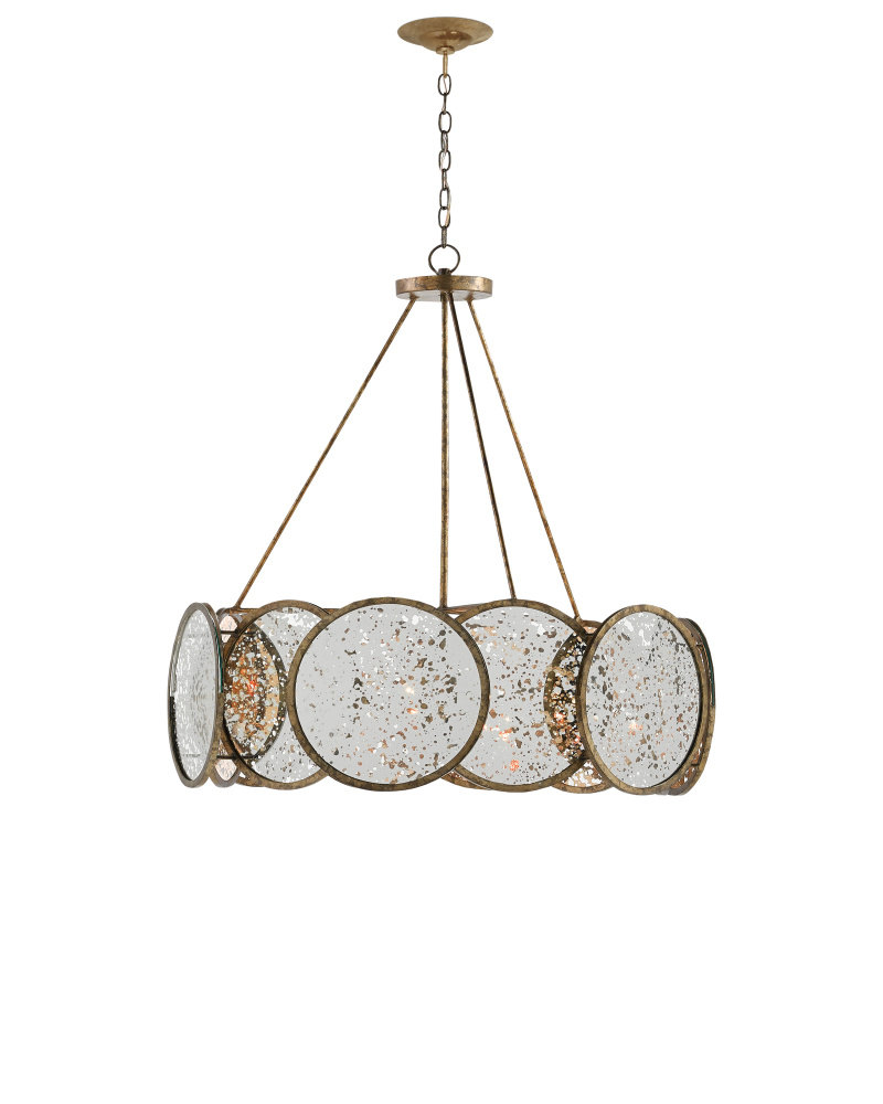 A ring of mirrored panels brings the Oliveri Chandelier an extra dose of luminosity. The circle of circles dangles from a canopy on thin bands of wrought iron in a Pyrite bronze finish. The distressing and the tones of the finish echo the darker patinas in the Raj mirror set within by the rounded metal frames of this mirrored chandelier. Adjustable from 42" to 111" with use of included chain/rod kit/cable. If your space calls for a longer drop, additional chain/rods/cable is available for purchase.