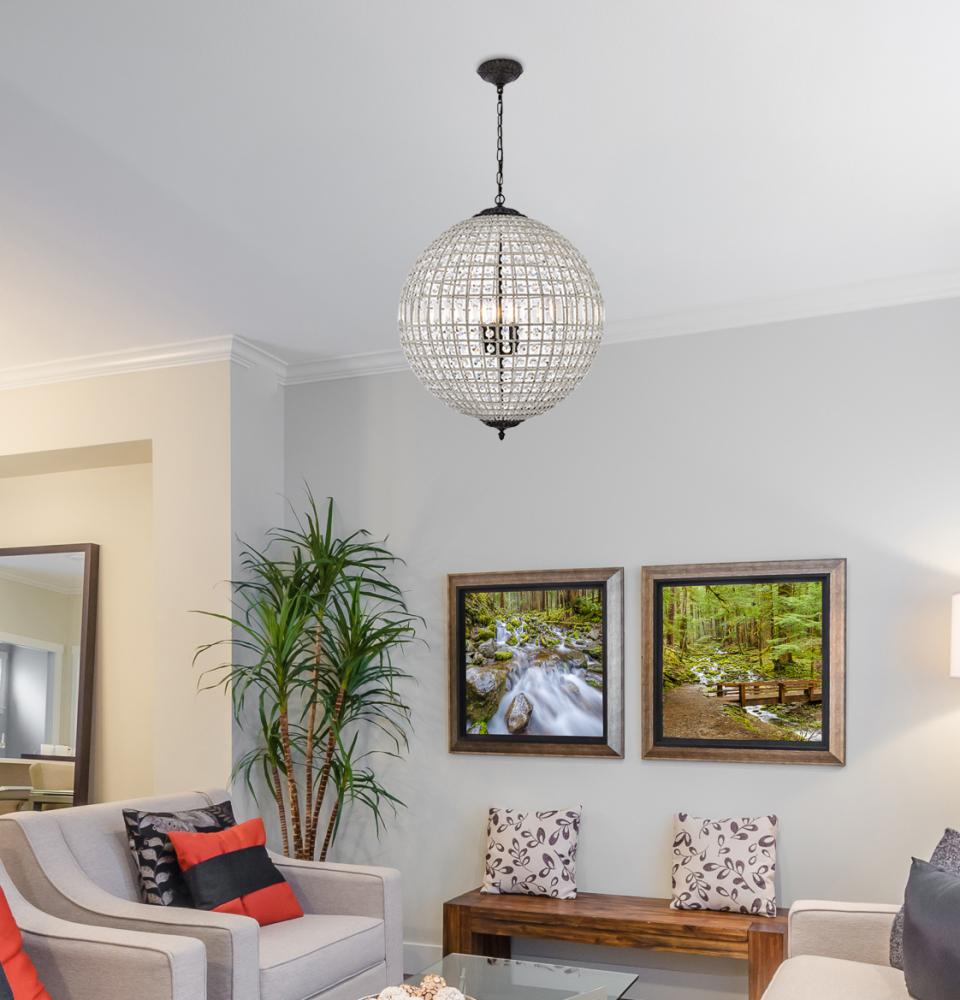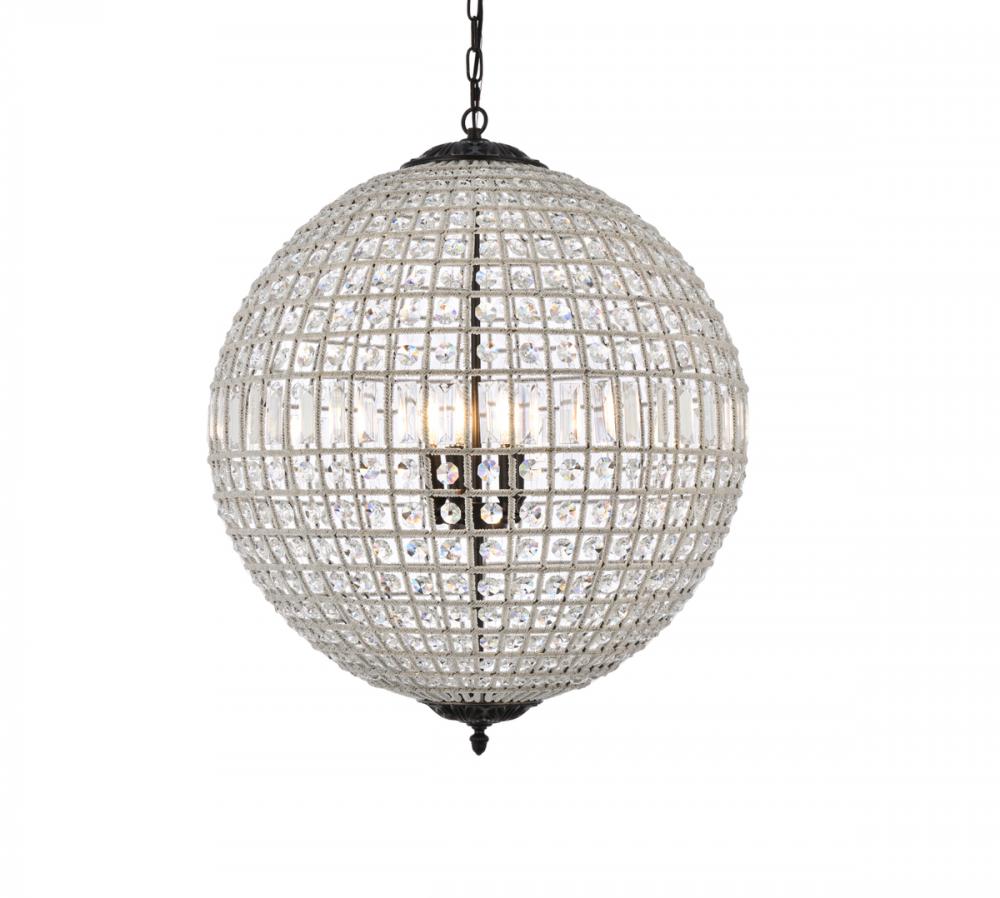 Straightforward form and effortless beauty make Olivia hanging lamps the crowning glory of your dining room, living room, kitchen, bathroom, or stairwell. The classic sphere design sparkles with a shell of multifaceted, royal-cut clear crystals. Steel rims and chain available in dark-bronze or French-gold finish add vintage flavor to contemporary style.