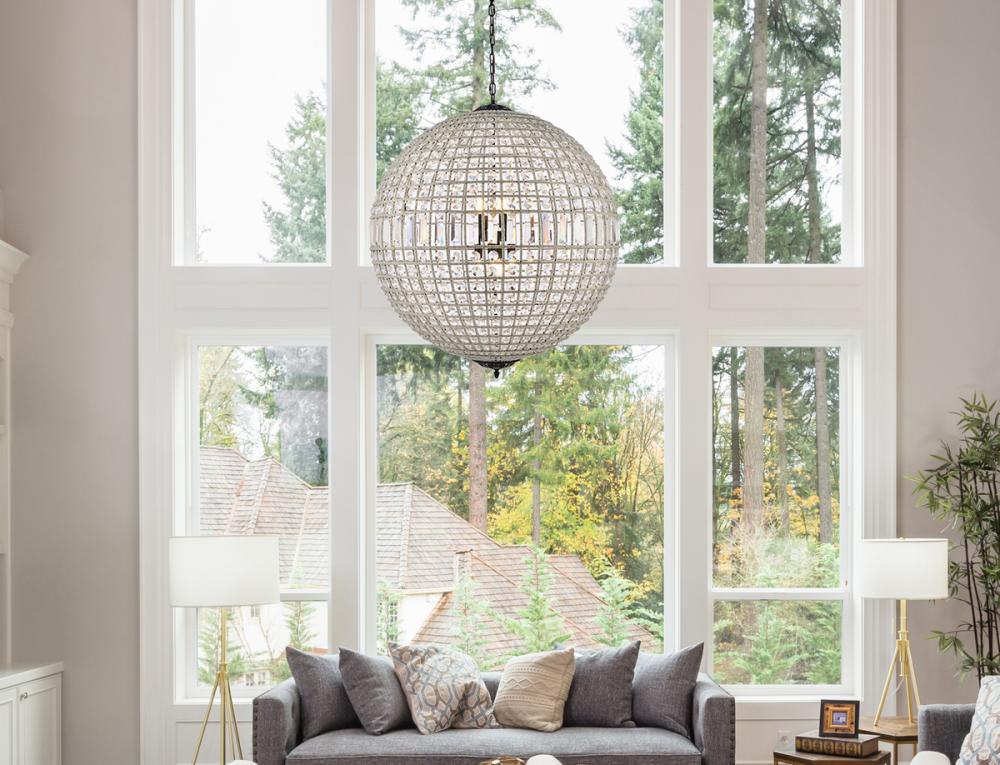 Lamp features a diameter of 36 inches, a height of 41 inches, and requires 8 candelabra lights