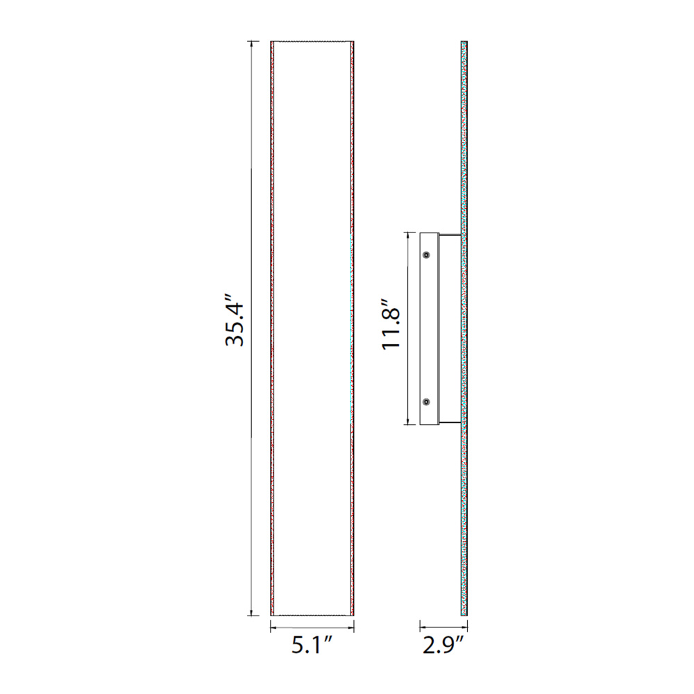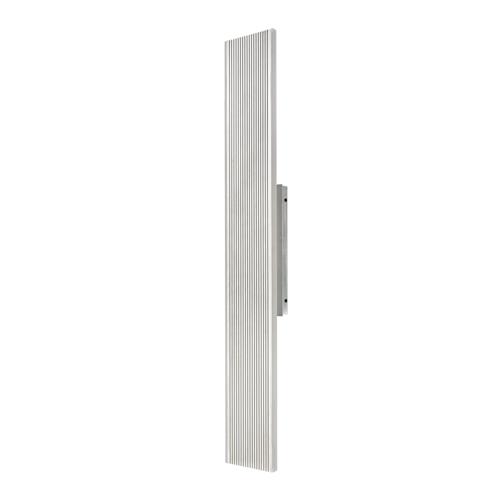Ultra sleek and wide 35" all-terior marine grade LED wall sconce. Architectural vertical incisions within the aluminum frame provide a unique texture to these fixtures. With our slatted brushed aluminum marine grade finish with matte black groves. Integrated replaceable dimmable LED 3CCT 3000K, 3500K, 4000K.